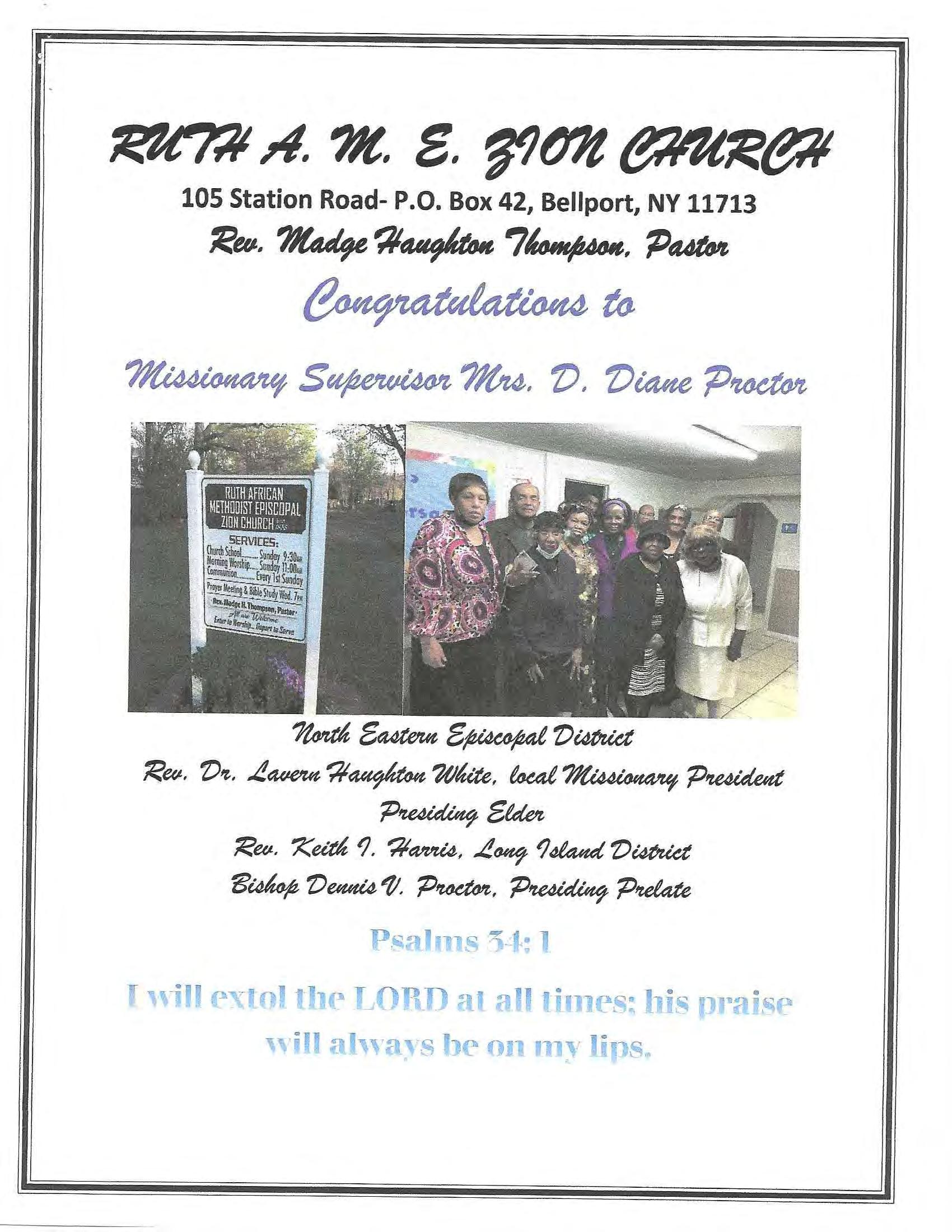 Rush Temple A.M.E. Zion Church 119-48 Sutphin Blvd. Rev. Xavier E. Hunter , Pastor Congratulations Missionary Supervisor Proctor on all you have done for the Northeastern Episcopal District! Love the members of Rush Temple!
