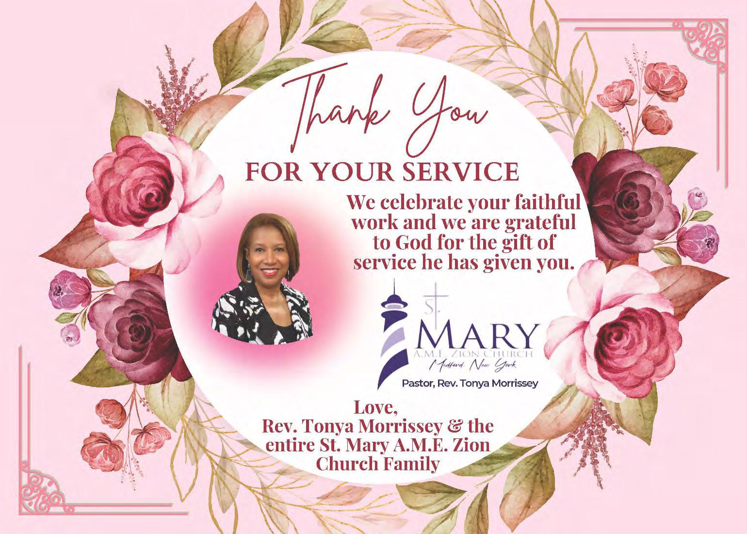 We honor the work and dedication that you’ve done in our district as well as, internationally, impacting the lives of people both near and far. We dedicate this Ad in honor of our deceased members who worked 40-plus years, diligently building and sustaining St. Francis in Mount Kisco. They have greatly impacted the integration and collaboration of the people from the African Diaspora in the town of Mount Kisco.