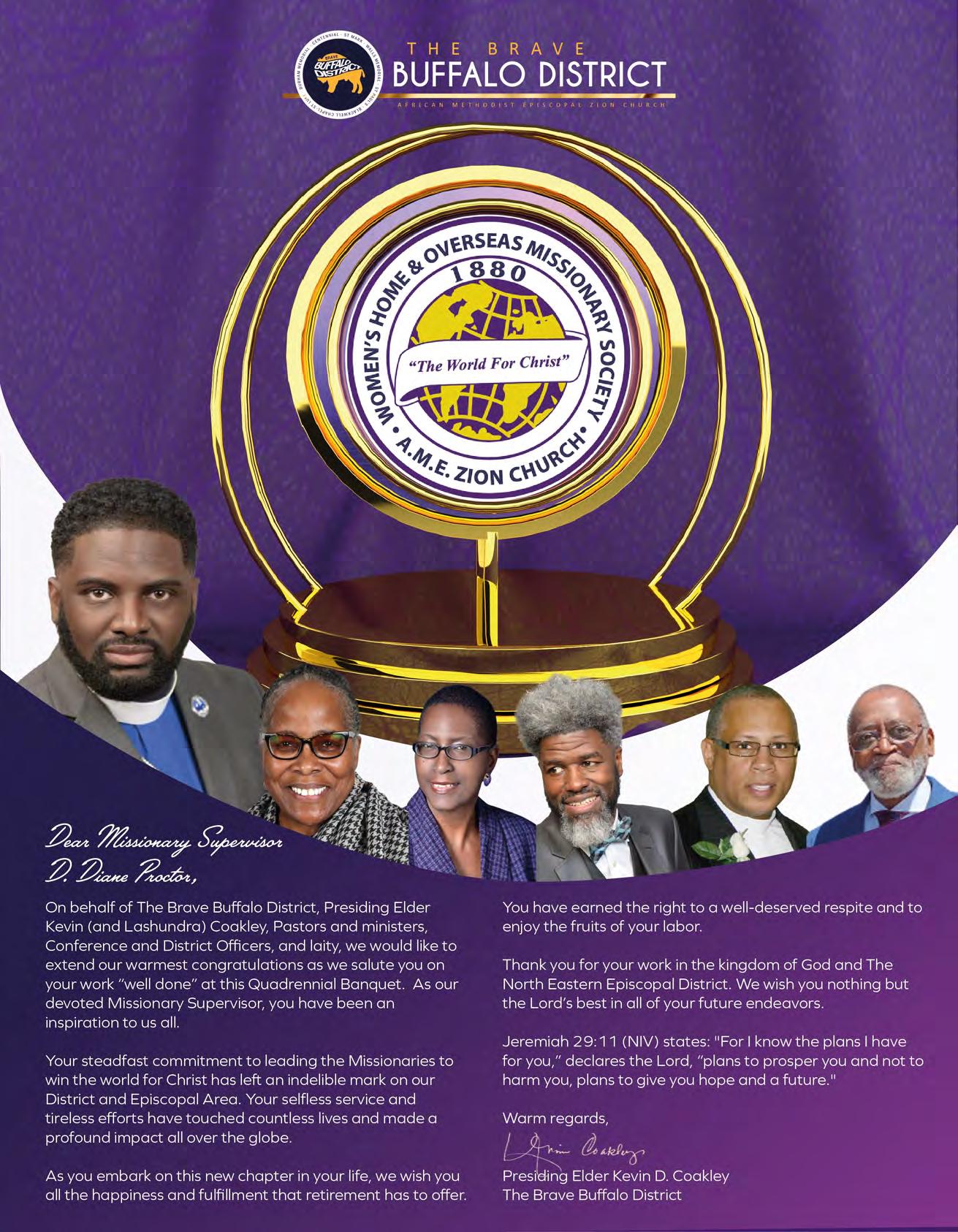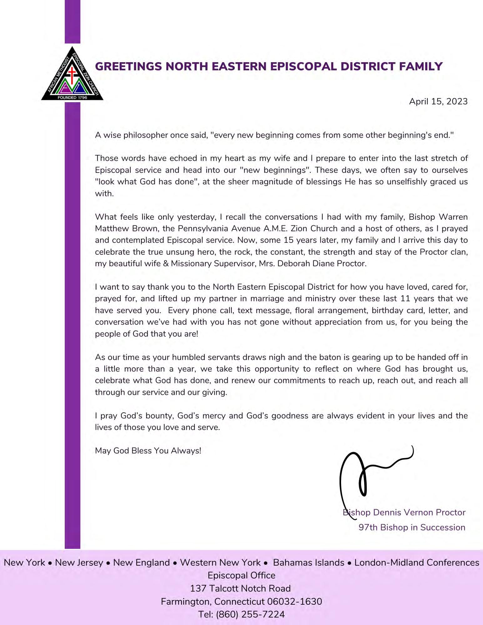 We also thank you for your years of service to the North Eastern Episcopal District. Please receive these words of thanks, appreciation, and honor from all of us in the North Eastern Episcopal District. These greetings have been collected and bound in this commemorative journal for you.