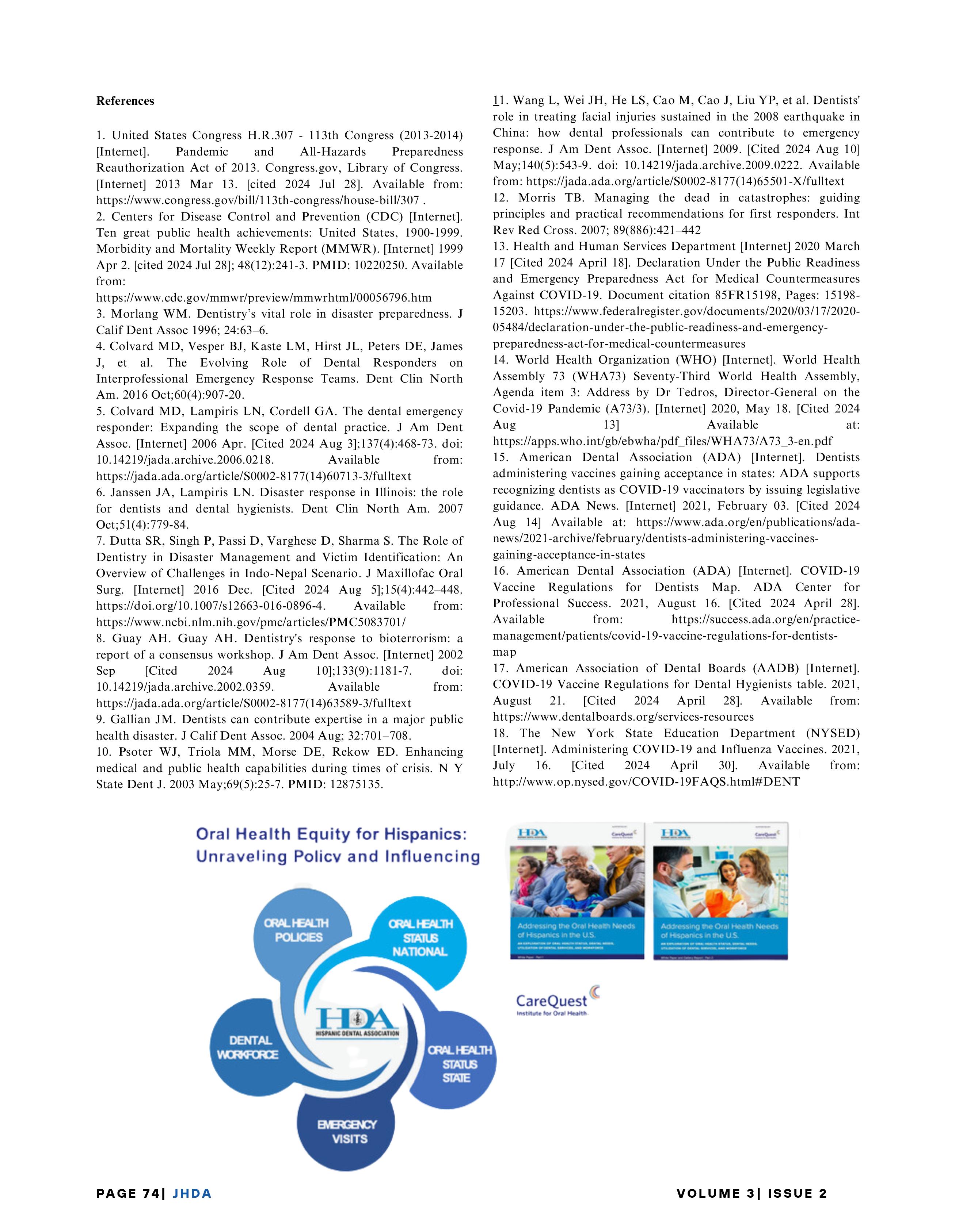 Conclusion: Health policy updates are needed to integrate dental professionals in Disaster Emergency Interdisciplinary teams and as a vital component of the public health response system in the United States.