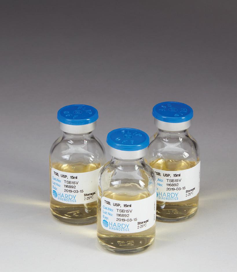 High Quality Materials - Glass vials are filled with TSB and sealed with a chlorobutyl stoppers and blue plastic caps.