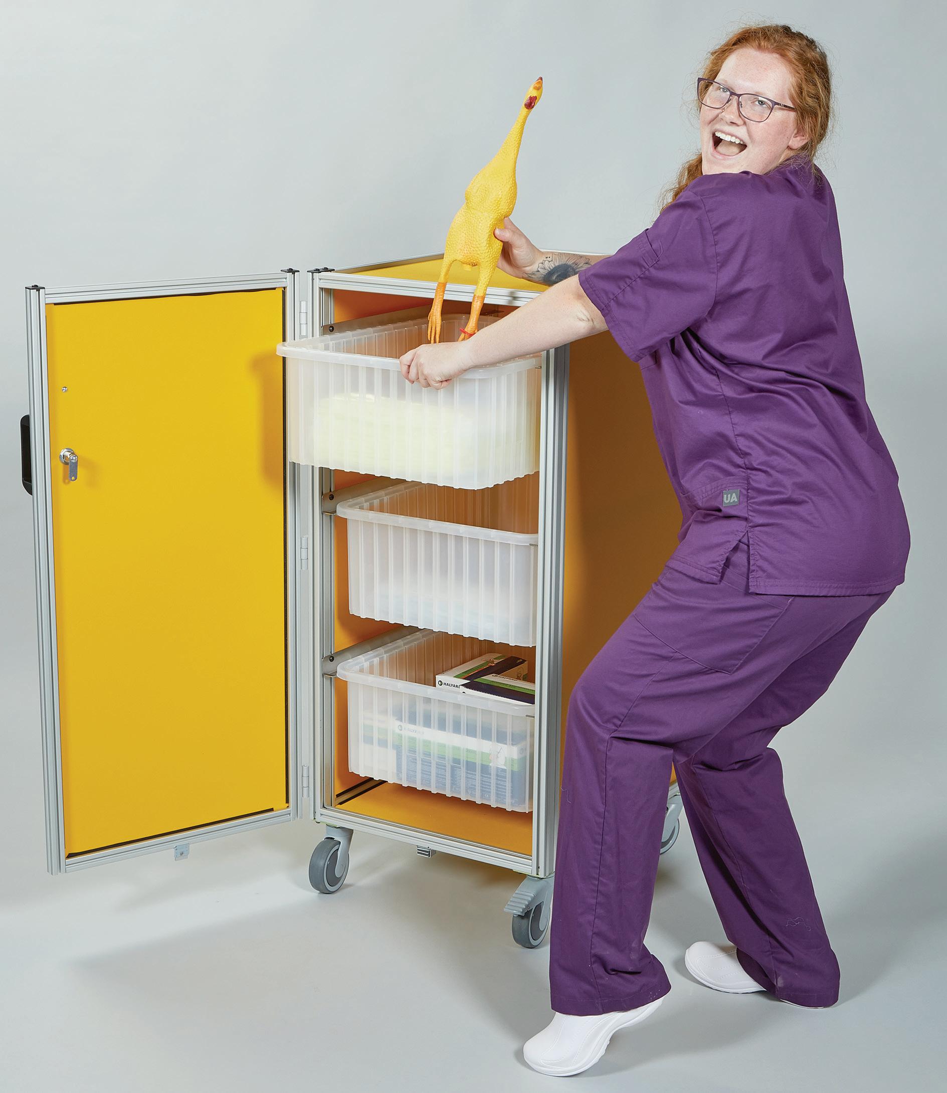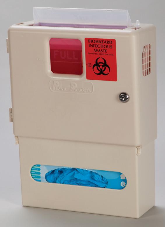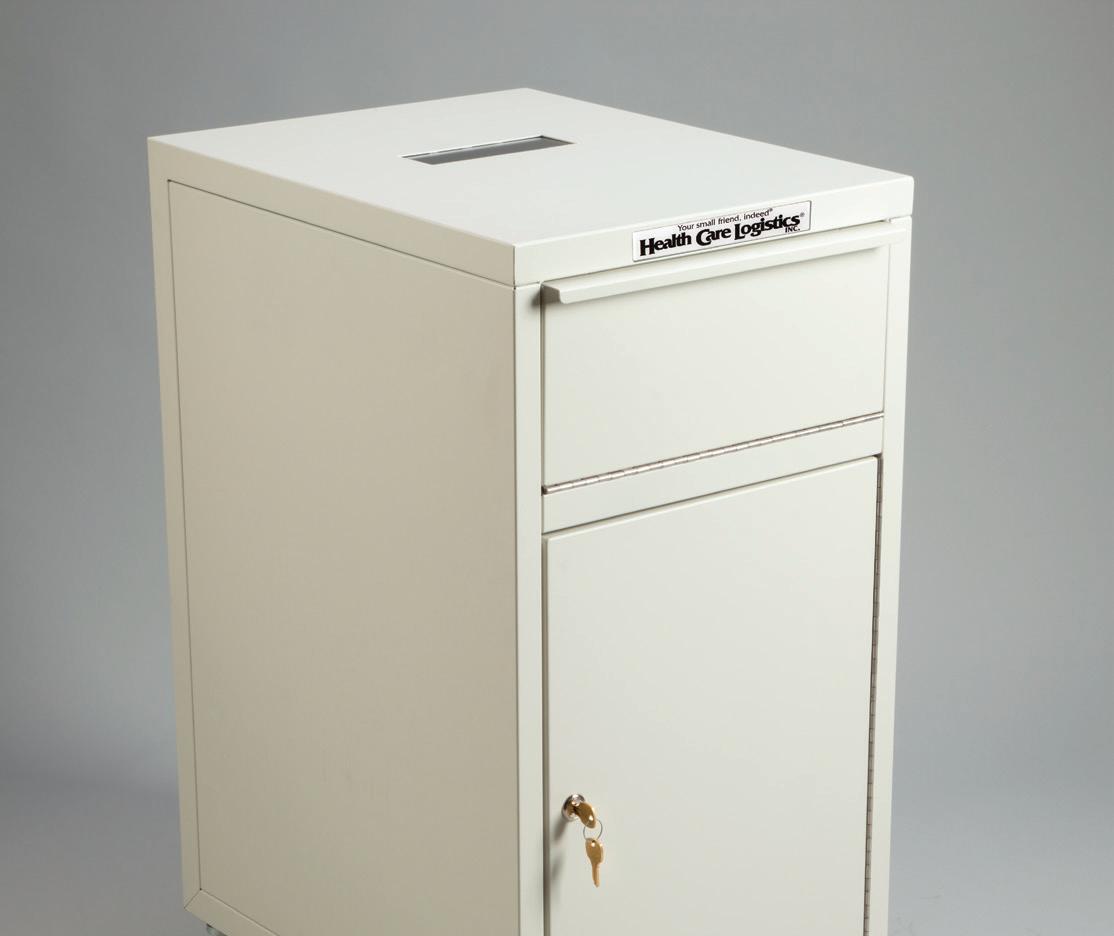 - Holds 4 glove boxes, 2 mask boxes, 1 box of gowns and has a disposal drop slot
