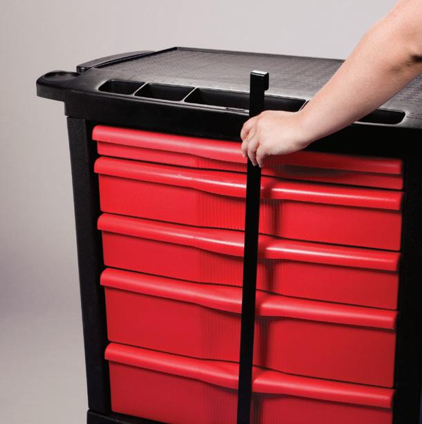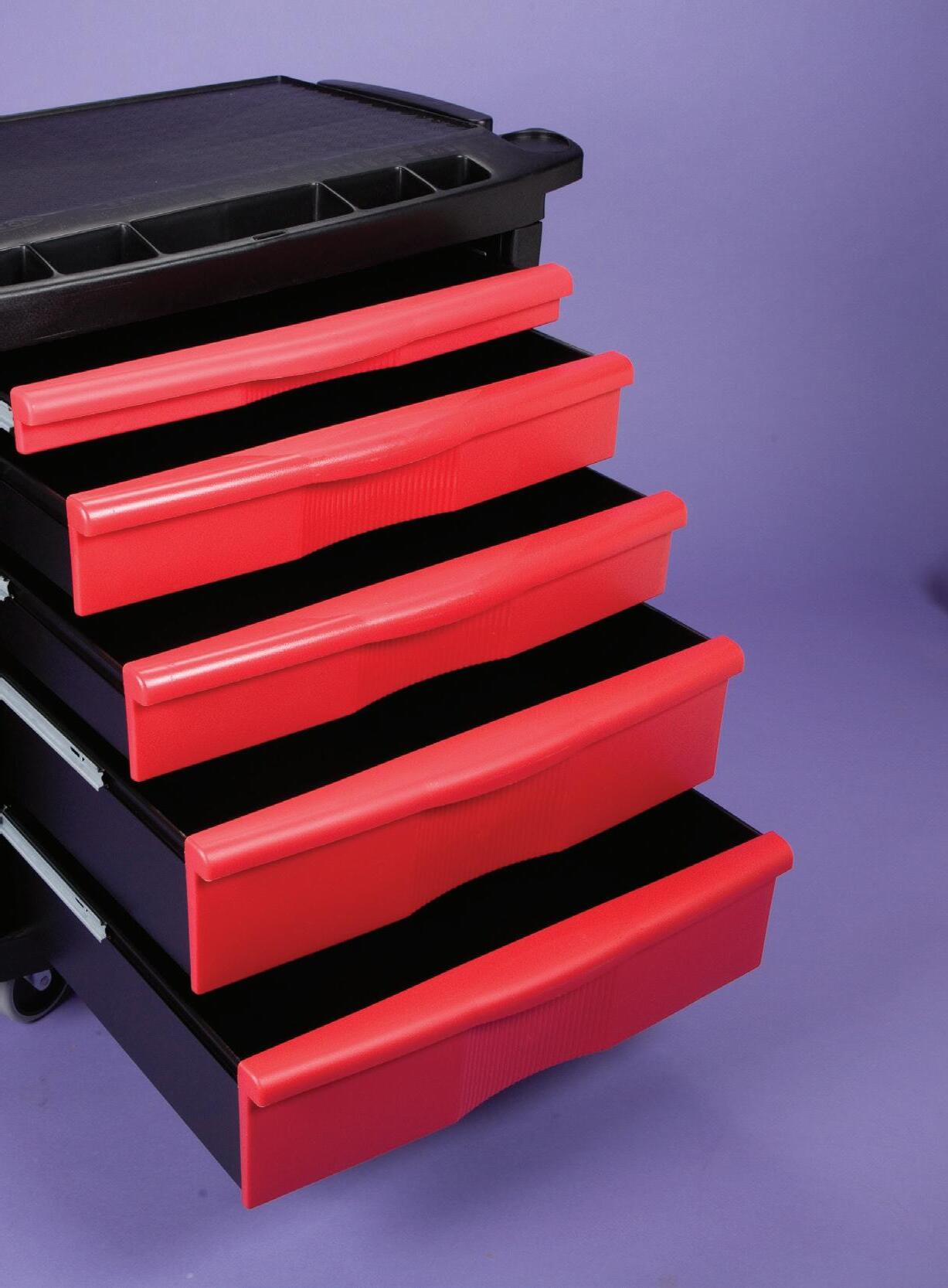 - Drawers - (3) 3"H, (2) 6"H, (1) 9"H with ball bearing slides push in and lock even after the cart is secured