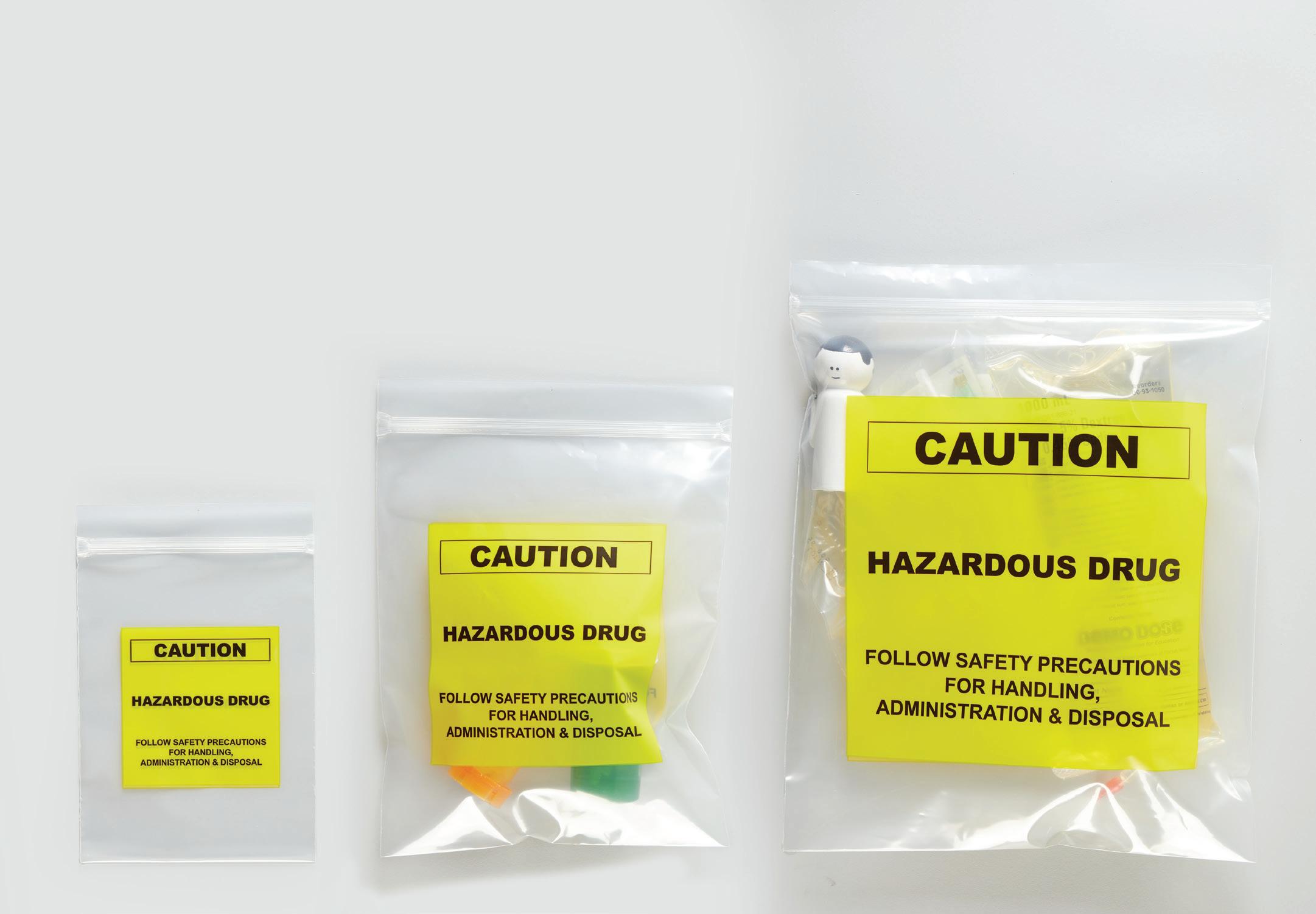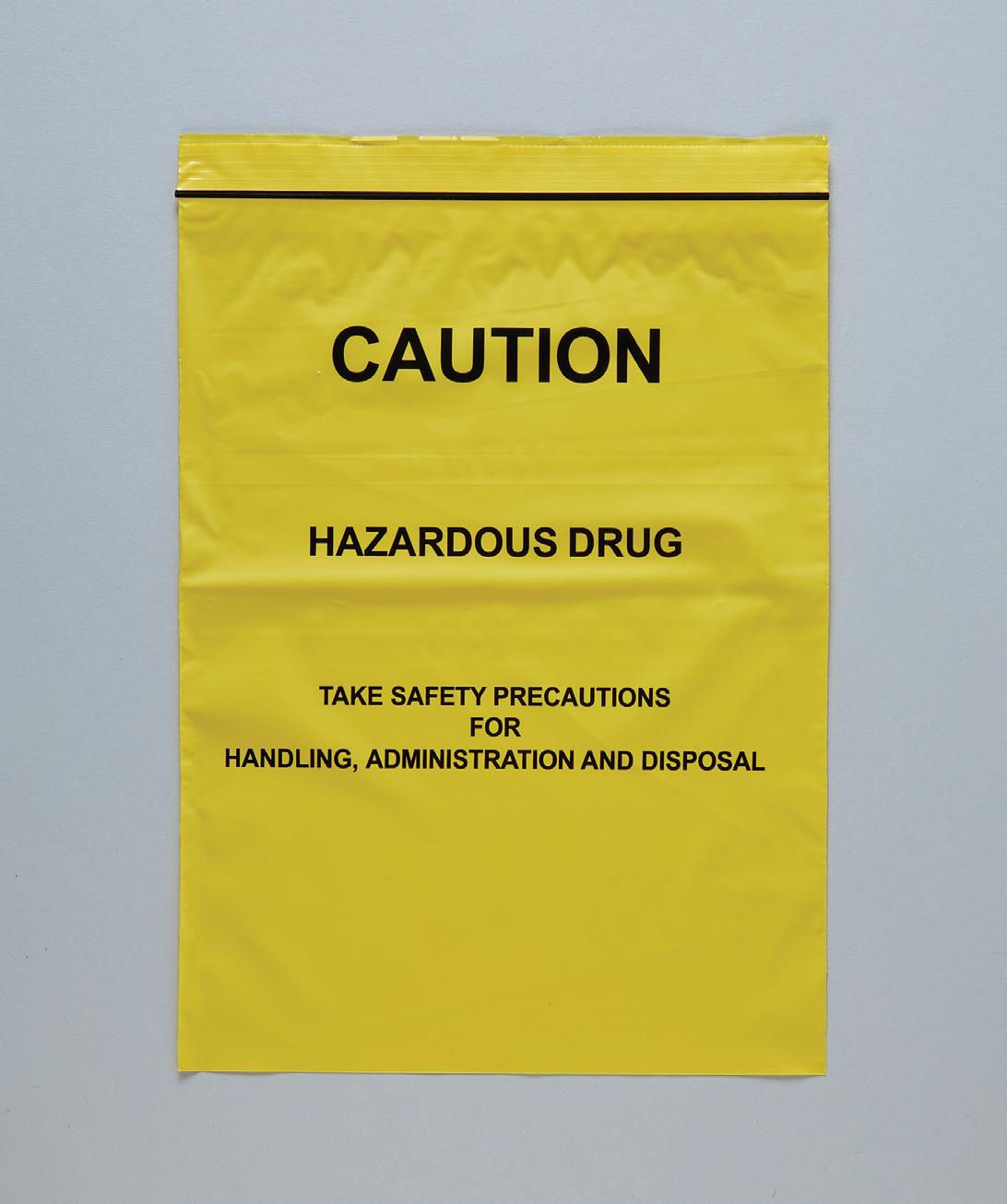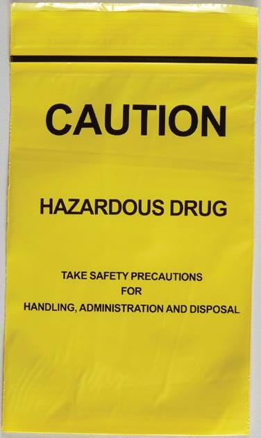 Preprinted Message - Clear bags with Black text and Yellow border alert workers to special instructions when working with hazardous drugs.