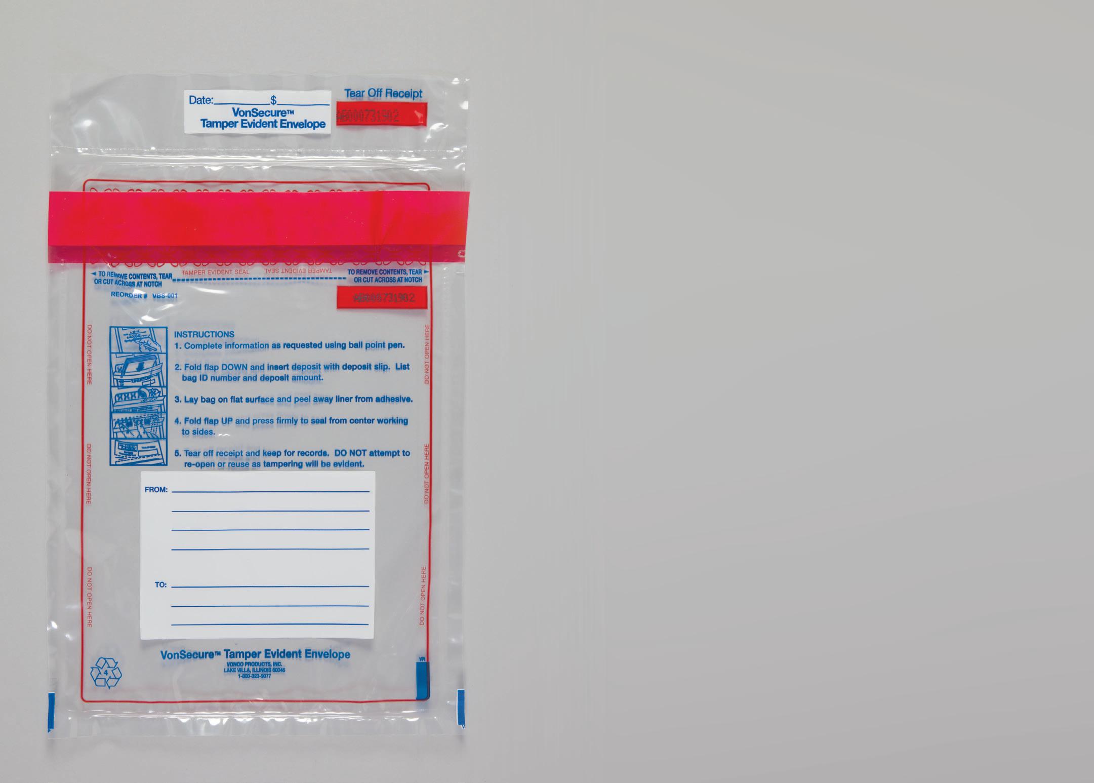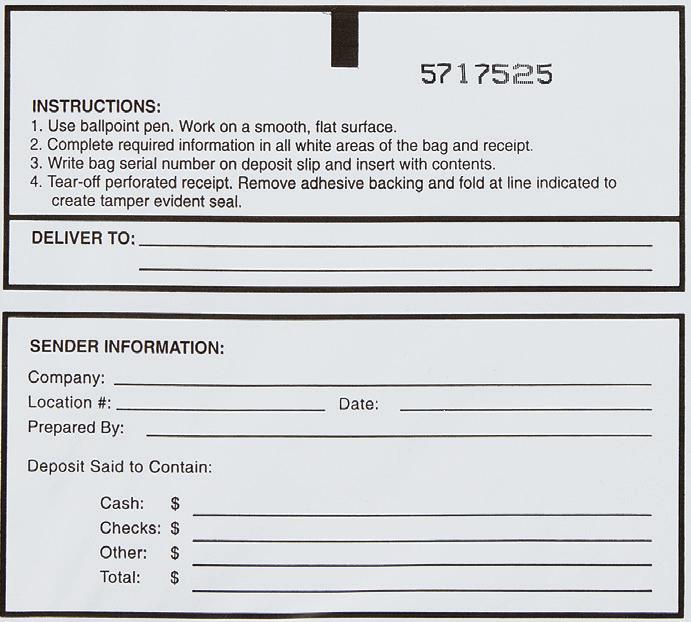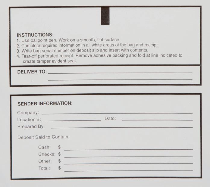 Add Documentation - Exterior window provides space for special instructions. Information is inserted and removed from the inside of the bag for paperwork security.