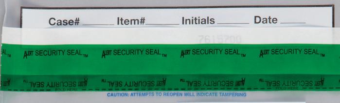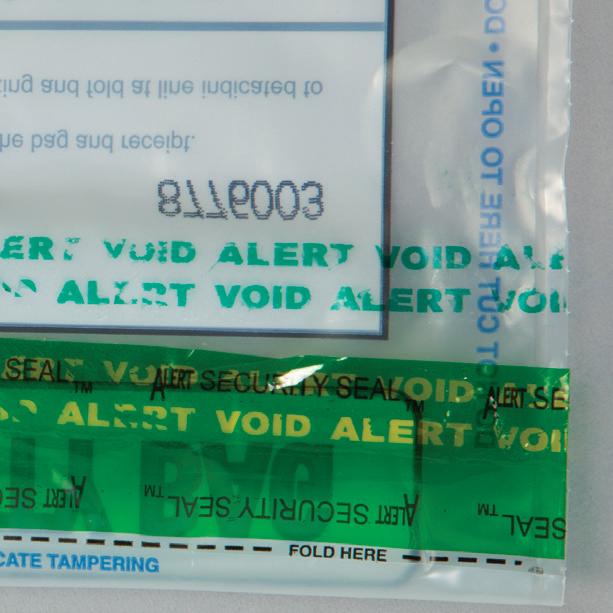 - Dual serial numbers and a tear-off receipt provide traceability - Permanent pressure-sensitive adhesive flap reads “VOID ALERT” if opened after sealed