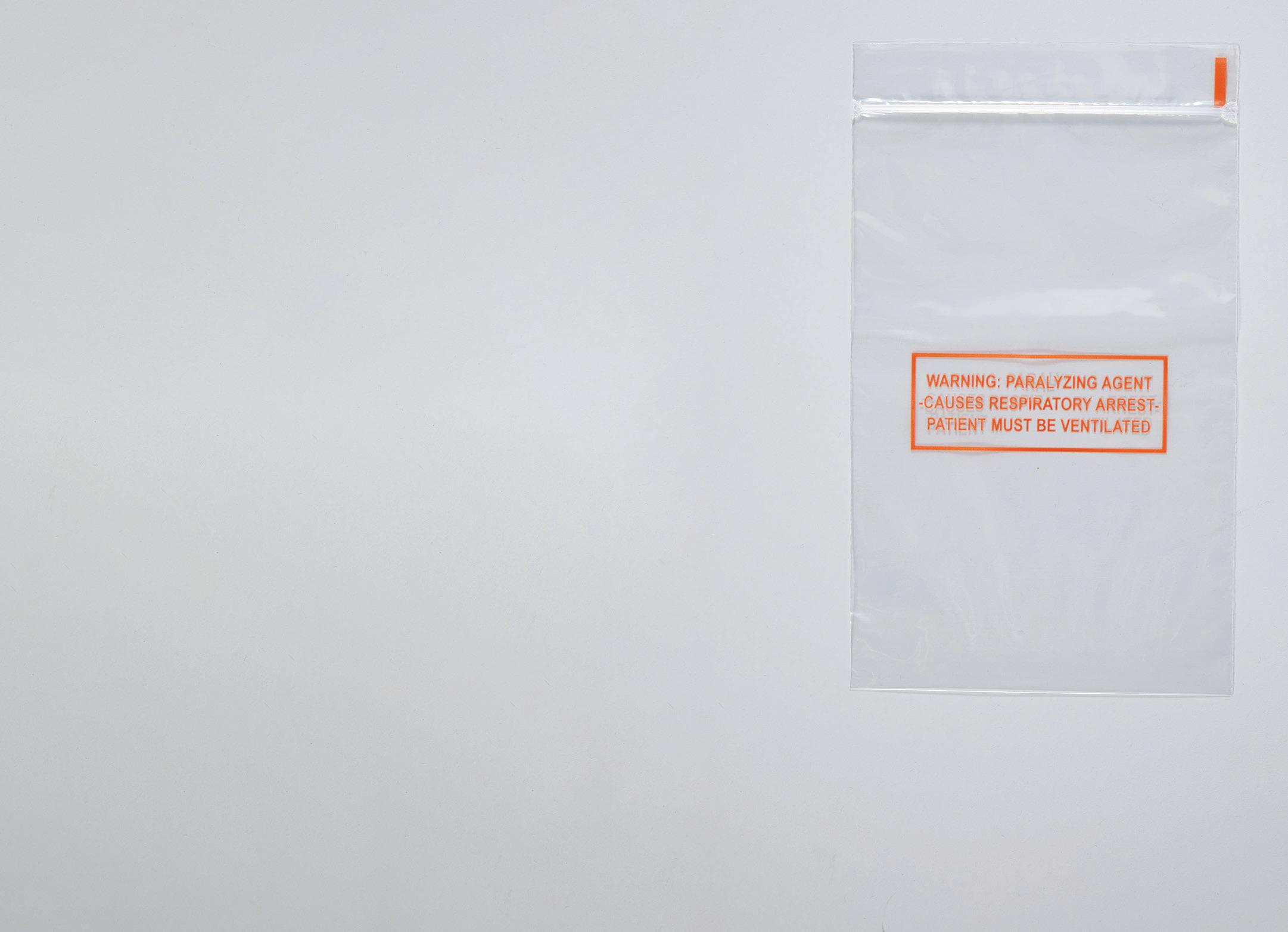 Preprinted Message - Clear bags with Orange text and border alert workers to respiratory paralysis according to recommendations from ISMP 2018-2019 Targeted Medication Safety Best Practices for Hospitals.