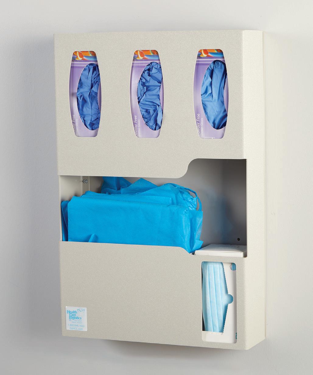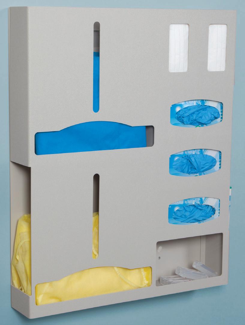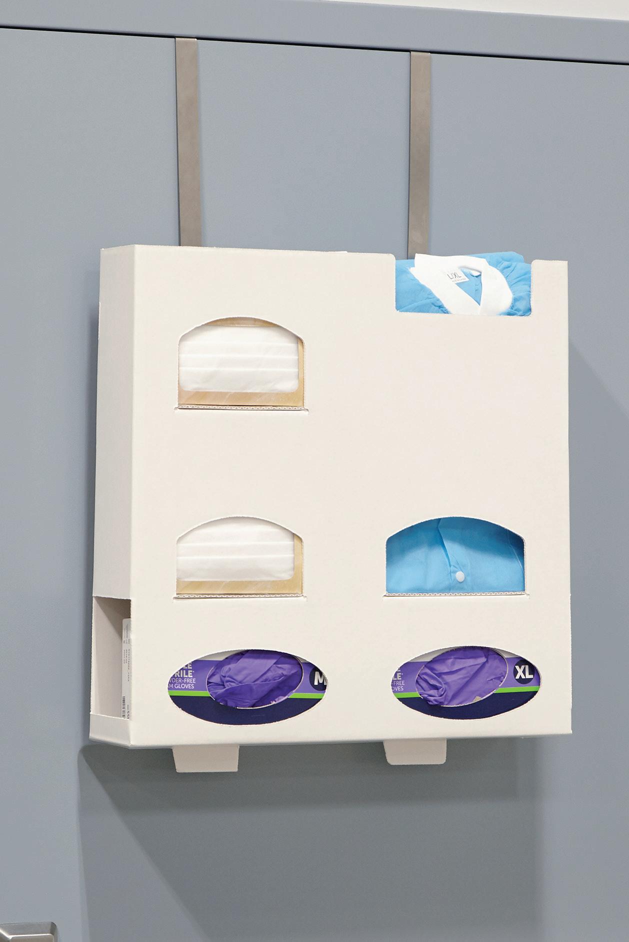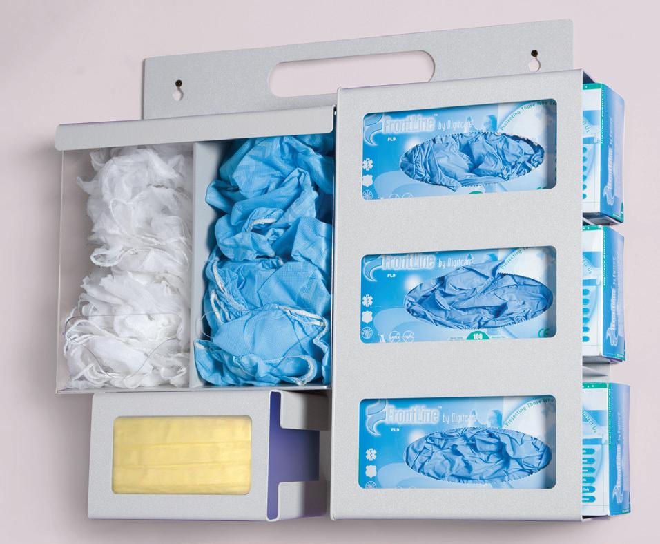 20467 - Includes sections to store flat-pack disposable gowns, 3 boxes of gloves and a box of face masks.