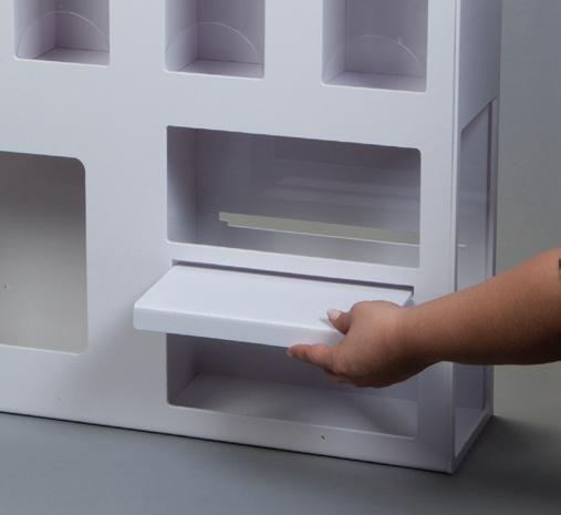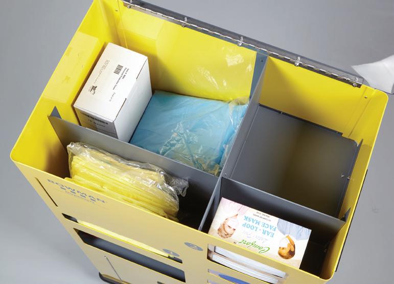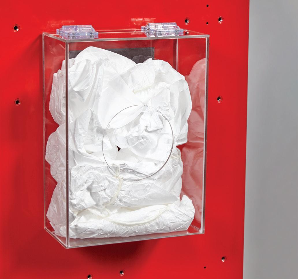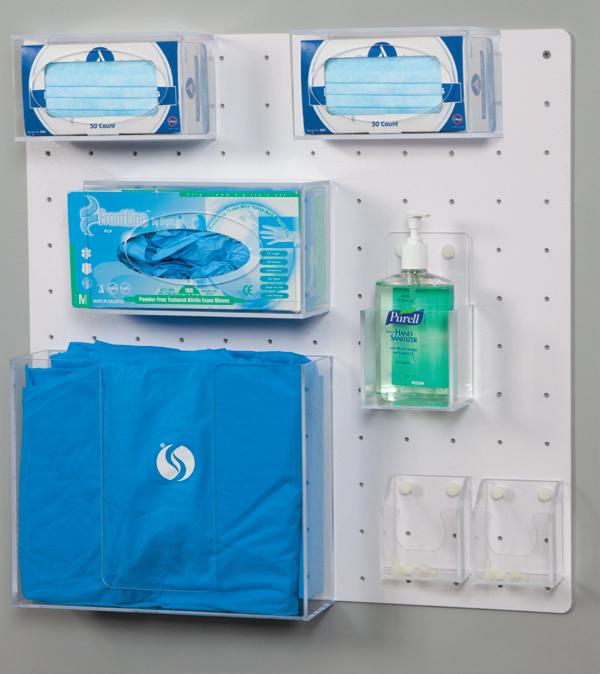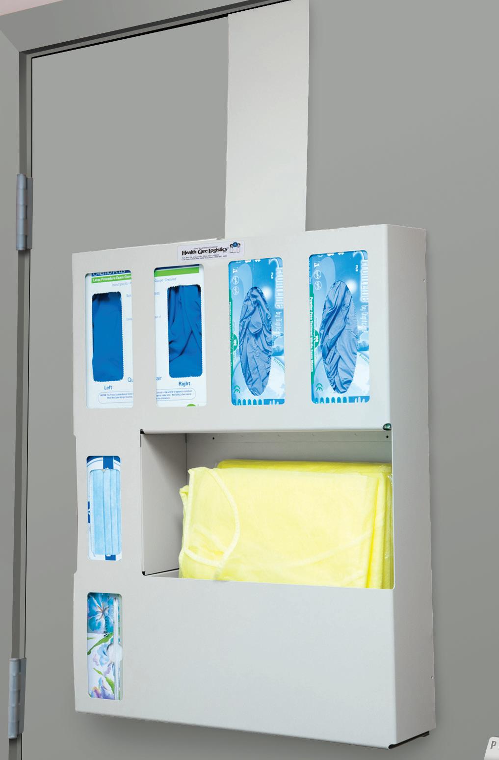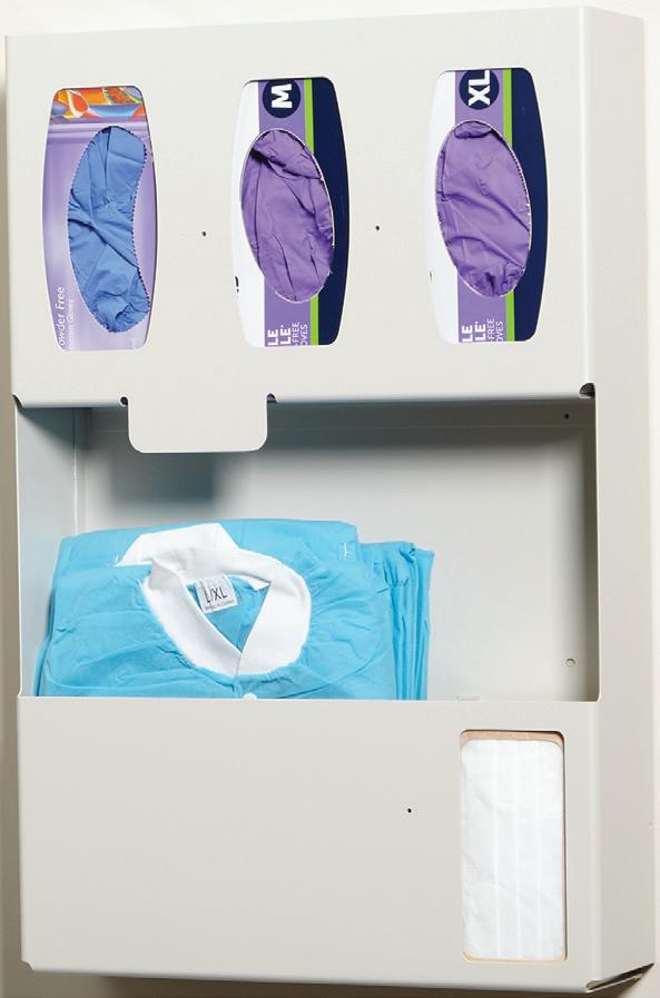 20467 - Includes sections to store flat-pack disposable gowns, 3 boxes of gloves and a box of face masks.