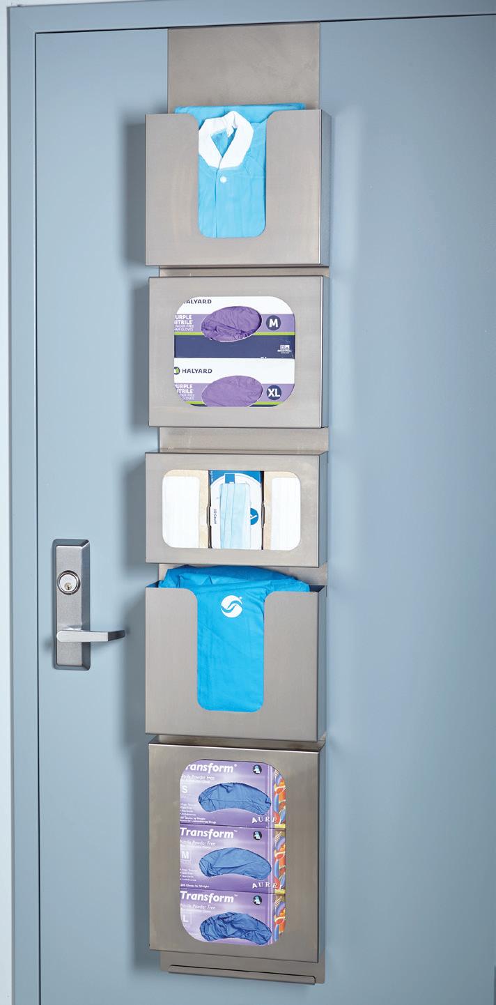 Construction - Provides multiple dispensing spaces for a combination of boxed PPE items including gowns, gloves, face masks and face shields. Ideal for use near a cleanroom area.