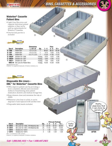 Disposable Bin Liners DBL™ for Waterloo® Cassette Bins • DBLs improve patient care by providing a more consistent, efficient and convenient method of maintaining clean patient medication drawers and medical storage bins. • Keep drawers clean and minimize the risk of (HAI). • Whenever a bin liner is soiled, it can be disposed of and replaced with another liner. • Disposable label inserts included.