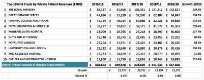 The published accounts for 2019-20 show that all of the top-earning private patient units are in London n p44