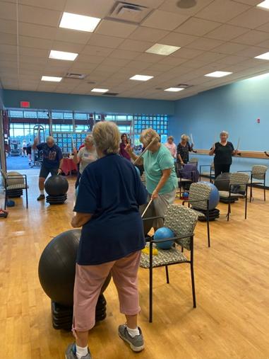 Penn Highlands Mon Valley Center for Fitness and Health recently held a member social filled with exercise, food and drums! Twenty of CFH's members gathered on a Thursday Morning in October to participate in the first member social and fitness drumming class. Group exercise instructor Kristy Fabean and member Bob Biskup led the class utilizing chairs, weights, exercise balls and drumsticks.