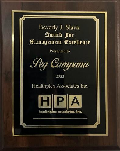 Peg enjoys the day to day operations of the facilities “no two days are alike, you never know what each day will bring but when the day is over I know that everyone that walked through the doors has received my best.” “Over the years my job has been made easier by all of the wonderful colleagues, peers and staff that has worked together with me all with the same mission” This is Peg’s second Management Excellence award through HealthPlex Associates. She is now the only HPA manager who has received the award two times.