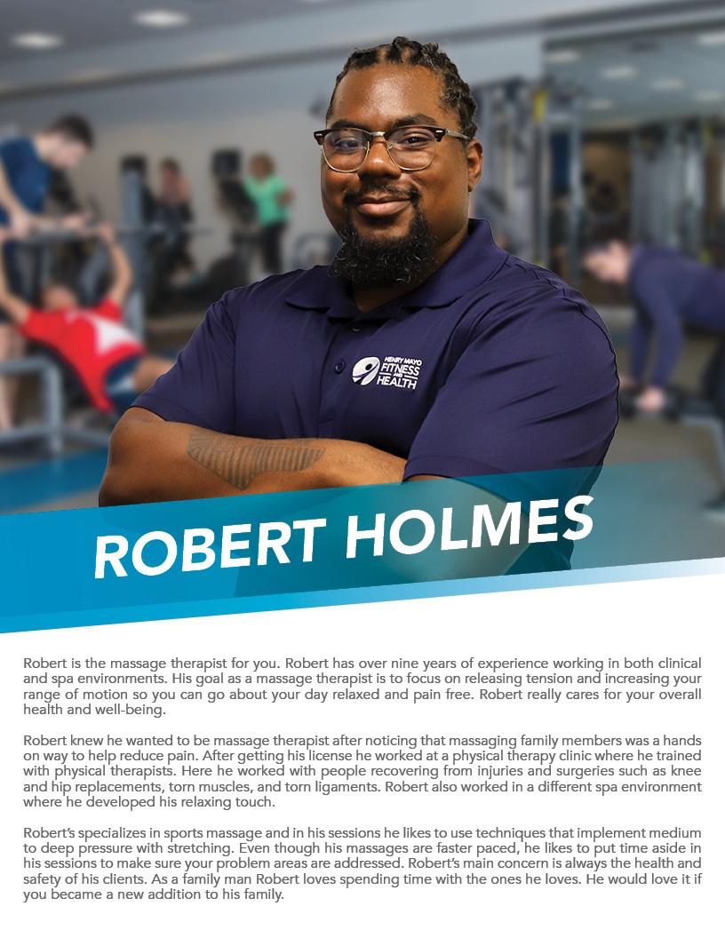 Henry Mayo Fitness and Health is pleased to welcome Robert Holmes to our staff. Robert was hired as a massage therapist and has been a huge addition to HMFH facility. Robert has over 9 years of experience working in both clinical and spa environments. After getting his license he worked at a physical therapy clinic where he trained with physical therapists. While there, he worked with people recovering from injuries and surgeries such as knee and hip replacements, torn muscles and torn ligaments. Robert also worked in a spa environment where he developed his relaxing touch. Robert specializes in sports massage and in his sessions he likes to use techniques that implement medium to deep pressure with stretching.