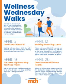 EACH WEDNESDAY THROUGHOUT THE MONTH OF APRIL, MISSION FITNESS STAFF MET AT MEDICAL CENTER HEALTH SYSTEM TO HELP FACILITATE WALKS WITH THE HOSPITAL EMPLOYEES AROUND THE CAMPUS.