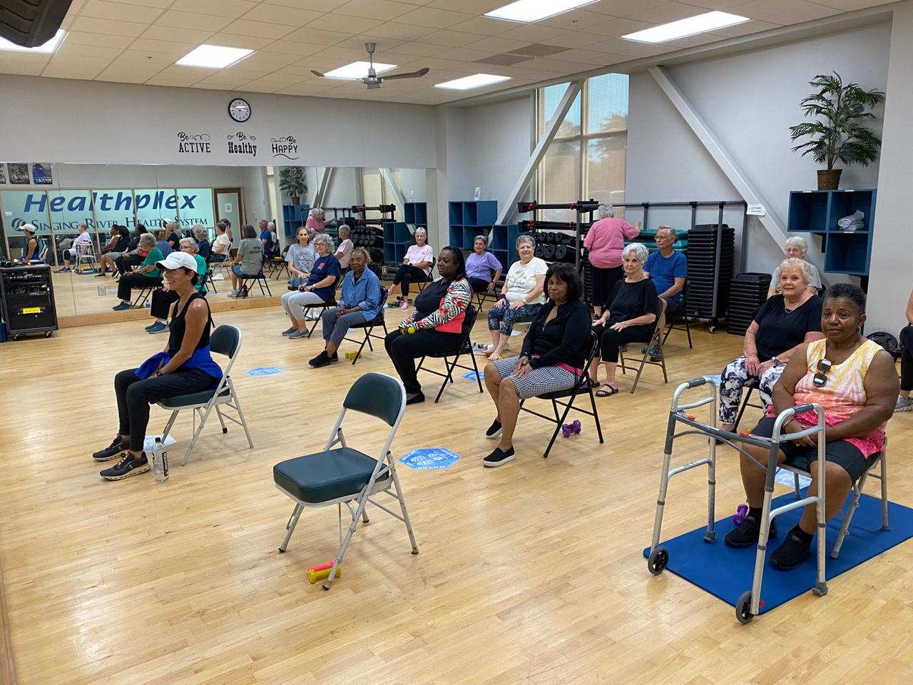 Going strong for over 10 years, the Chair Yoga class at Singing River Healthplex is a favorite among members. Focusing on movement, breathing, and how the body is reacting to the exercise creates a kind of moving meditation that promotes relaxation, reduces stress, and improves mental clarity. Like other forms of exercise, seated yoga may also help improve mood, confidence and relieve anxiety and depression. Some of our members have been taking the class for all 10 years!!