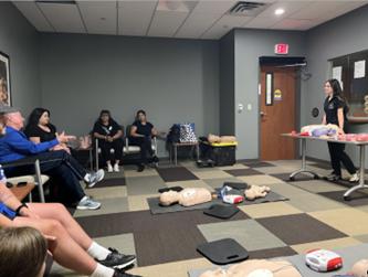 About twenty members of the staff of Mission Fitness recently completed certifications and recertifications in Cardiopulmonary Resuscitation (CPR), choking and proper use of the Automated External Defibrillator (AED). Unfortunately, only a small portion of the United States population is trained in CPR, but survival from Sudden Cardiac Arrest is dependent on the quick response of people, not only calling 911, but also starting CPR and using an AED as quickly as possible.