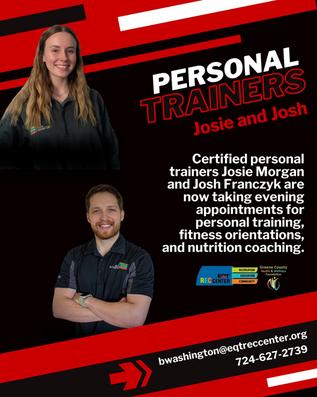 EQT REC has hired two new personaltrainerswhoarereadyto boost our program and motivated to make a difference in our members' lives! Josie Morgan is our new full-time personal trainer, andJoshuaFranczykisournewest employee, and he is part-time. They have both already made an impact at the REC, and we are so excited to see their continued success.