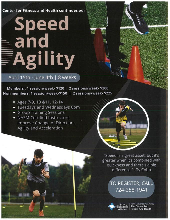 TheCenterforFitnessandHealthrecently kickedoffayouthSpeedandAgilityClass. Led by NASM certified trainers Eric Oblak and Kody Callaway, this class is perfect for the young athlete. Classes are broken down into age groups (7-9, 10&11, 12-14).
