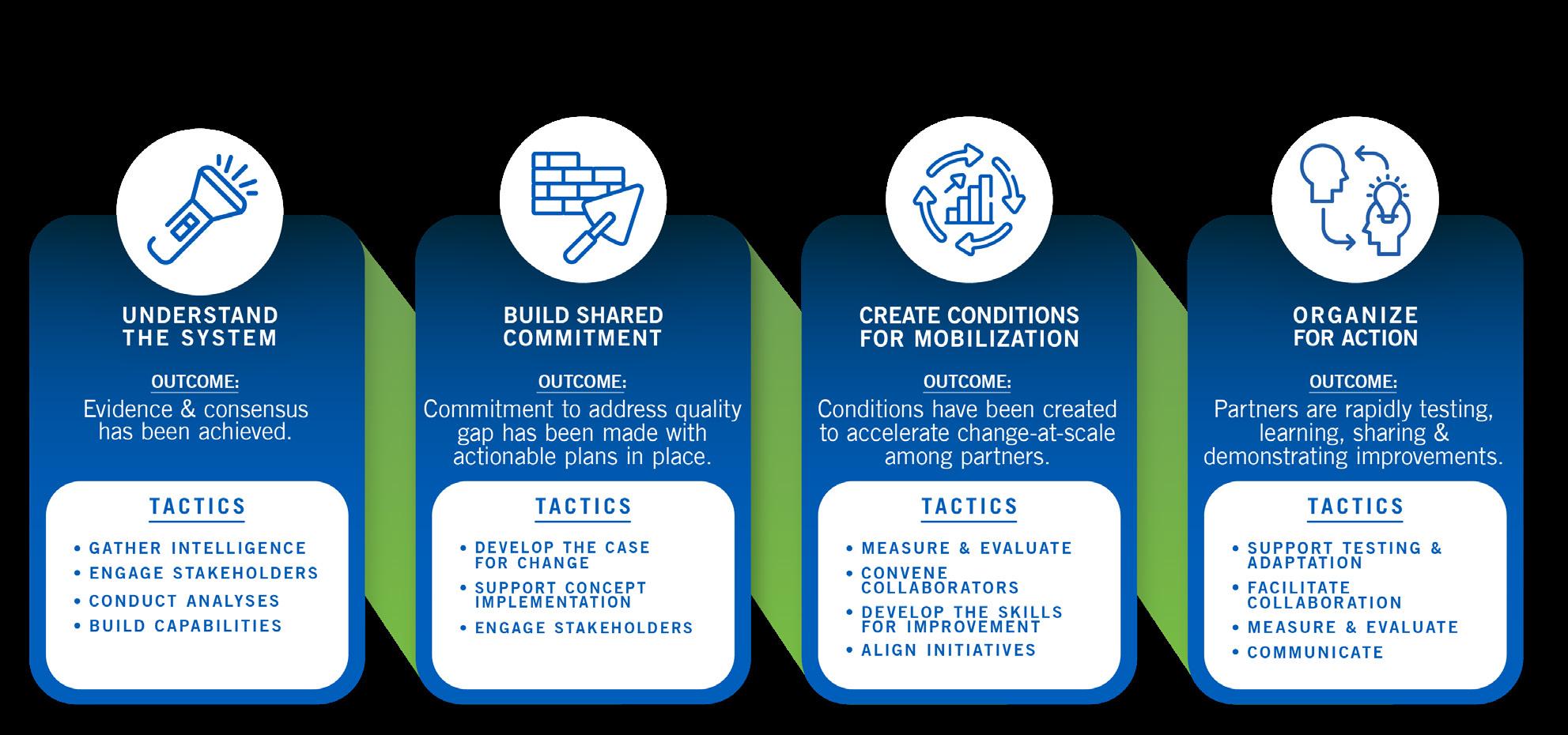 Here we work alongside our partner organizations to build improvement capacity, implement new methods, and accelerate change at scale. We achieve this by convening networks and events to connect and inspire, providing training to build improvement skills, and offering customized research and evaluation support. Together, we evaluate what’s working, share lessons learned, and build momentum for quality improvement.