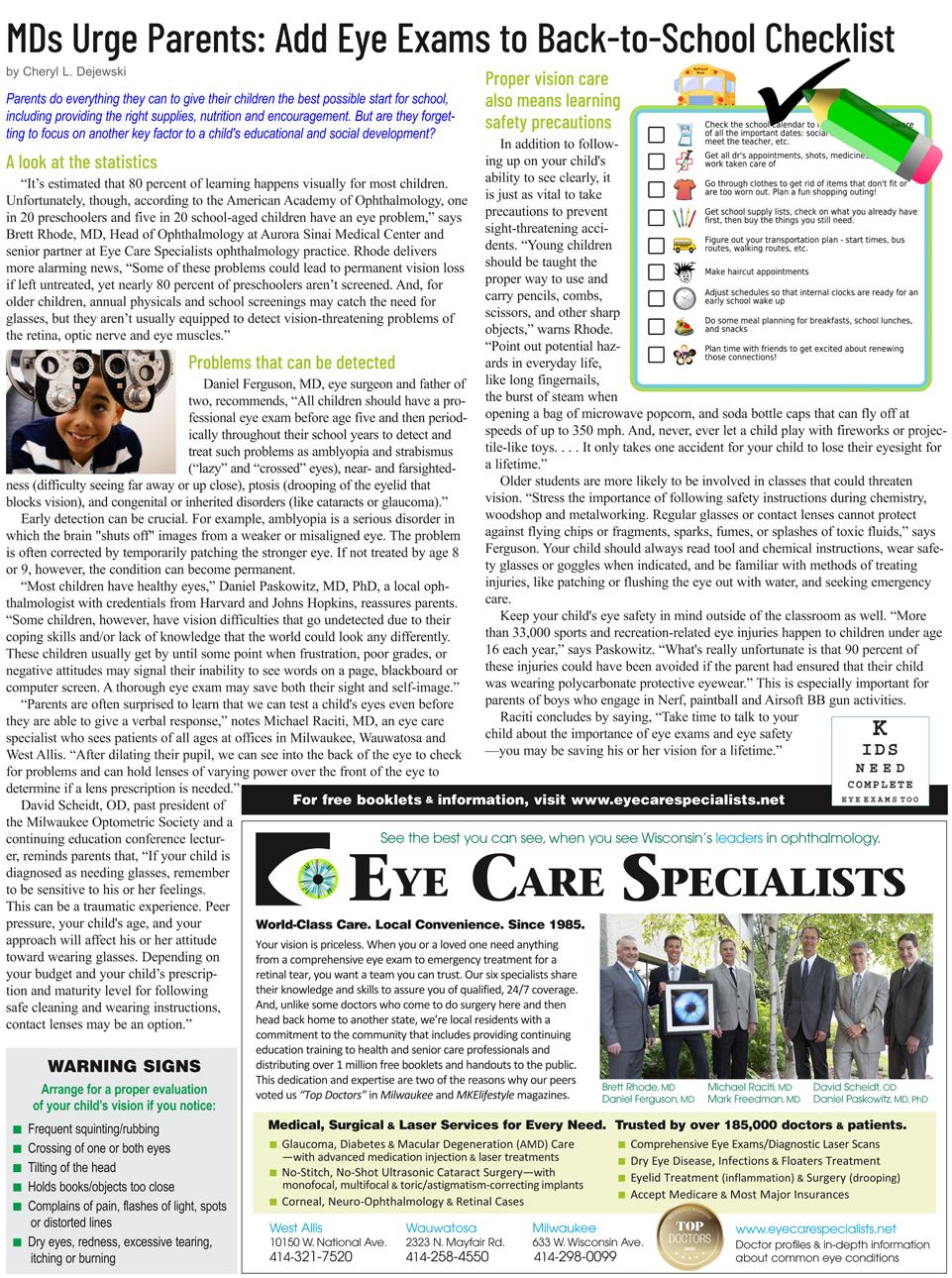 Daniel Ferguson, MD: We believe that education is critical to protecting and preserving vision and that it is important to make patients informed partners in their care. Our practice is one of the only ophthalmology groups in the country to write and publish its own educational materials on cataracts, glaucoma, diabetic retinopathy, dry eyes, macular degeneration, and countless other topics. In addition to our own patients, we have distributed more than one million booklets and handouts free-of-charge to senior centers, retirement communities, civic groups, health care professionals, and other individuals and organizations. Through education, we strive to encourage all Wisconsinites to seek and receive the best possible eye care.