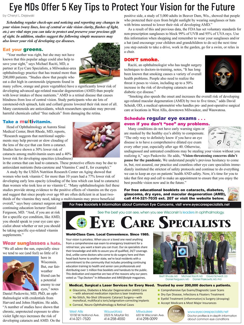 • Other prescription eyedrops can also be effective. Cortisone-like medicines called steroids can help reduce allergic symptoms. New eyedrops made from aspirin-like compounds can also provide excellent relief. To prevent side effects, you should only use these medicines under a doctor’s supervision. if eye allergies are hampering your activities and interests, make an appointment with an eye care specialist. He or she will be happy to evaluate your condition and prescribe the fastest way to get you outside enjoying activities with clear eyes. If you don’t have a specialist or are in need of a second opinion, the doctors quoted in this article have offices in downtown Milwaukee, West Allis, and the Mayfair mall area. They can be reached at 414-321-7520 or by visiting www.eyecarespecialists.net.