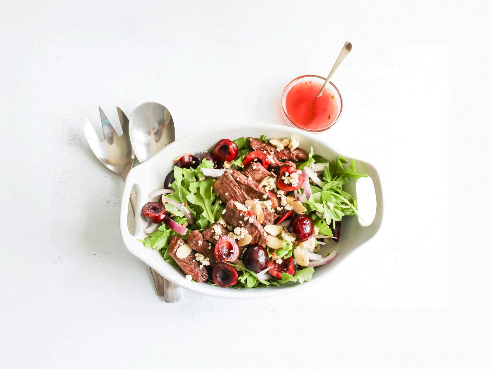 3 In a large salad bowl, layer arugula with cherries, almonds, blue cheese, and onion
