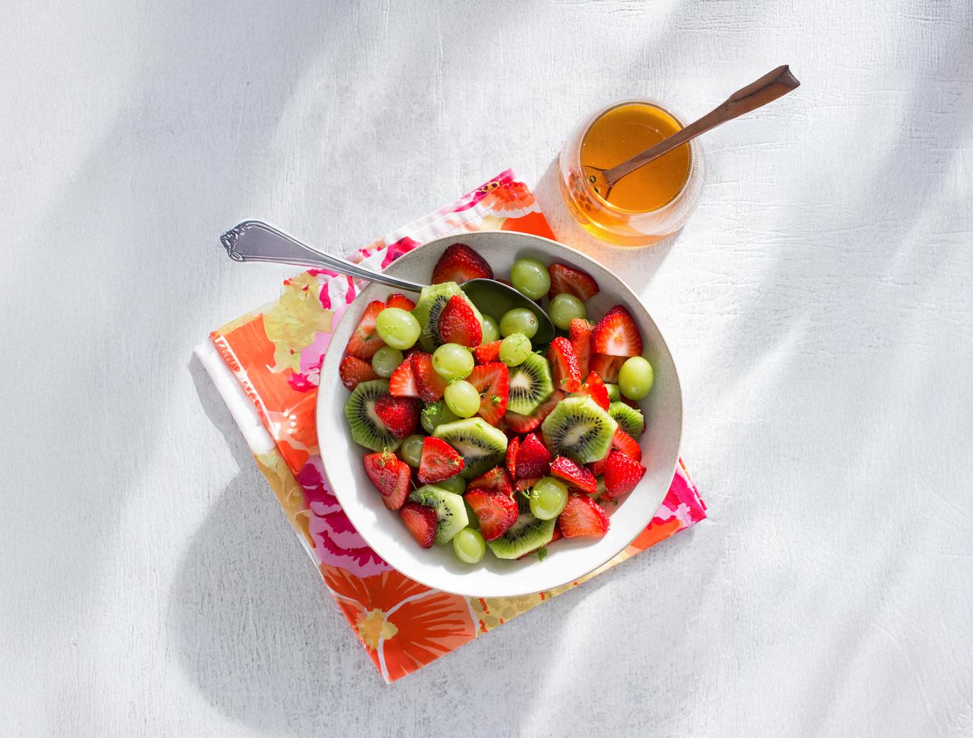 1.In a large bowl, combine the strawberries, kiwi and grapes.