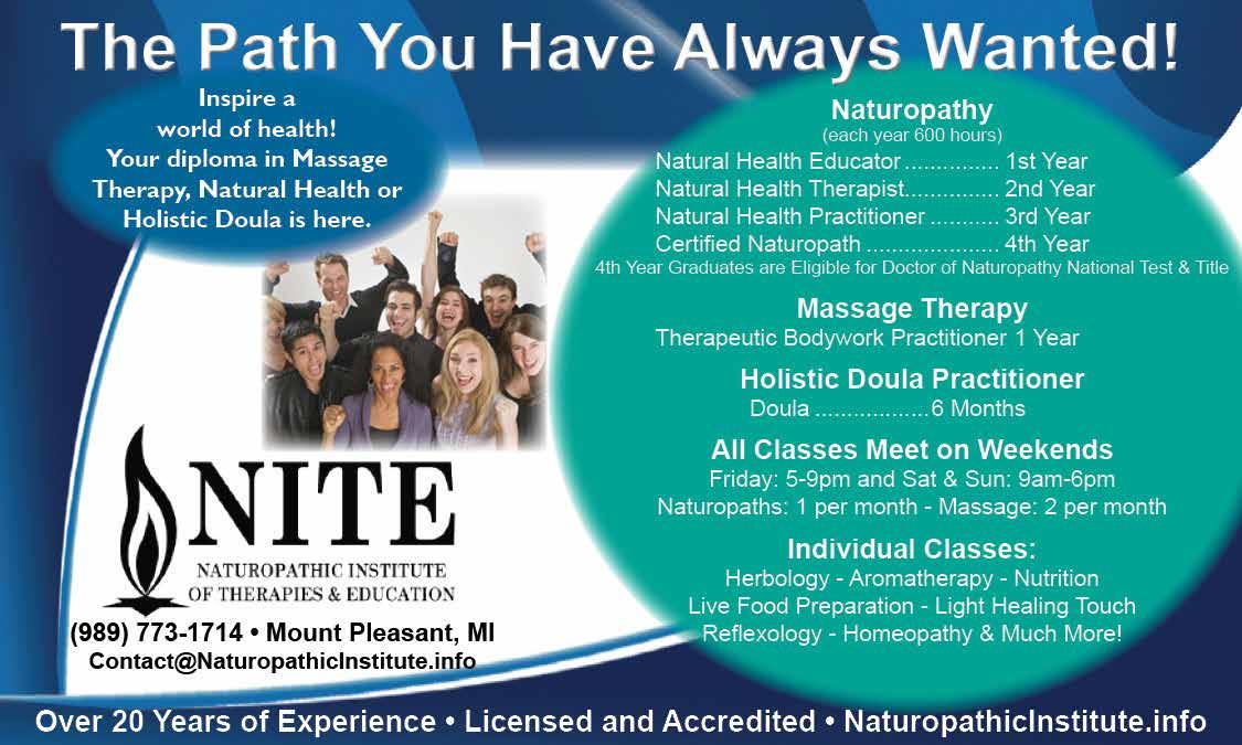 Educational pro grams offered: Natural Health Program: four years (one week end a month); Massage Therapy Program: one year (two weekends a month); Holistic Doula Practitioner Program: six months (one weekend a month). Indi vidual classes available. See ad page 9.