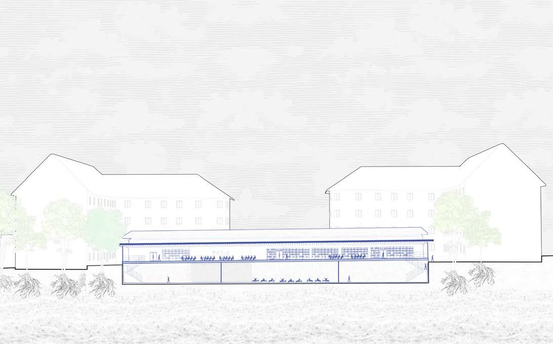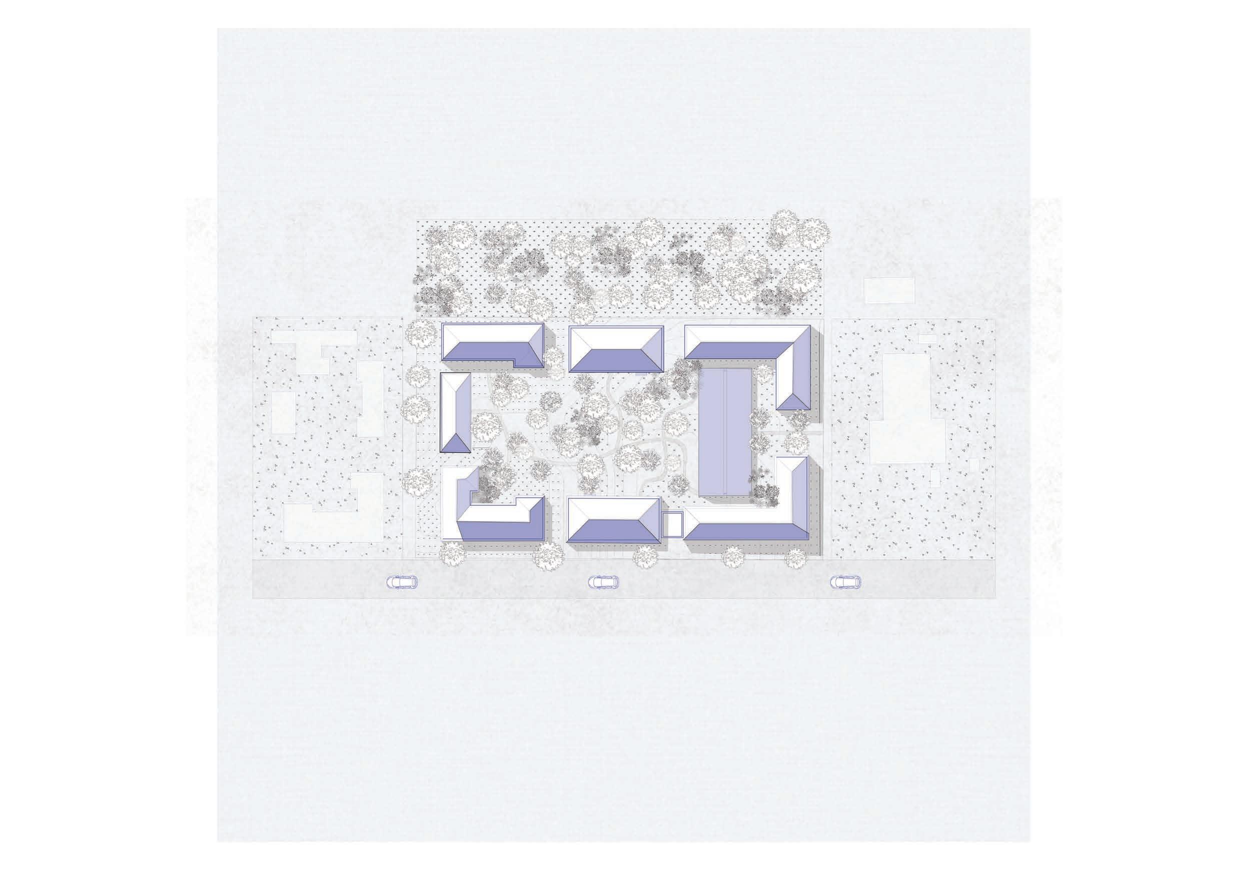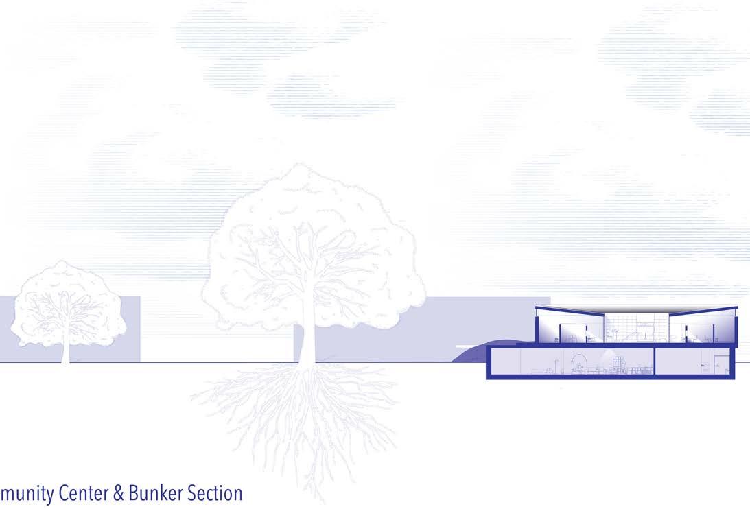 This project breathes new life into the site through added programs such as greenhouses for growing food, a bomb shelter repurposed as a horticultural education space, and a supervised play courtyard between buildings. A shared hallway inside mimics a front yard or sidewalk, while the surrounding park remains open for recreation.