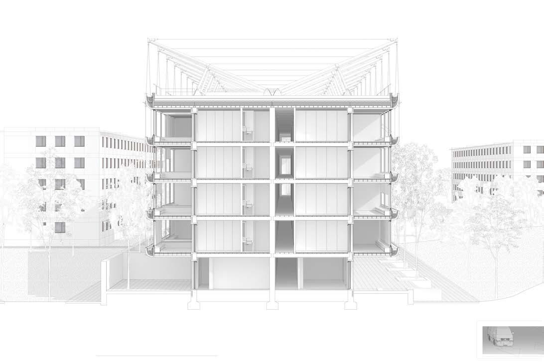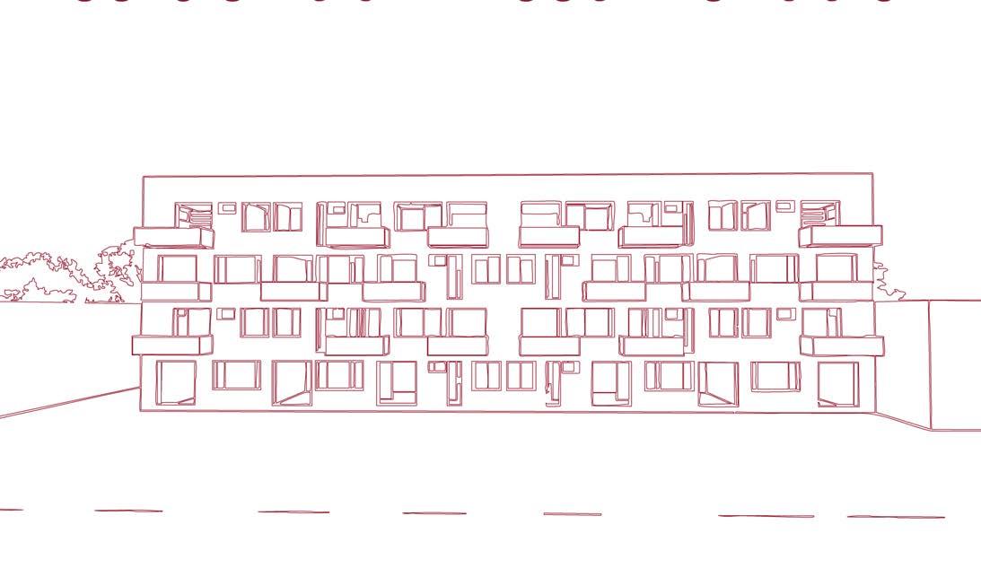 The concept focuses on preserving the original façade of the existing structure while redesigning the interior to better serve the surrounding community. The project includes a newly added elevators enabling vertical access to 8 individual housing units per floor each with new balconies. These semi-interior/outdoor transitional spaces provide insulation and multifunctional use: drying clothes, accommodating smokers, growing plants, or simply offering extra room. Positioned in front of a central garden, these balconies can also function as elevated viewing platforms for performances held in the garden space below. Additionally, the left side of the building houses a dedicated dance and theater production space.