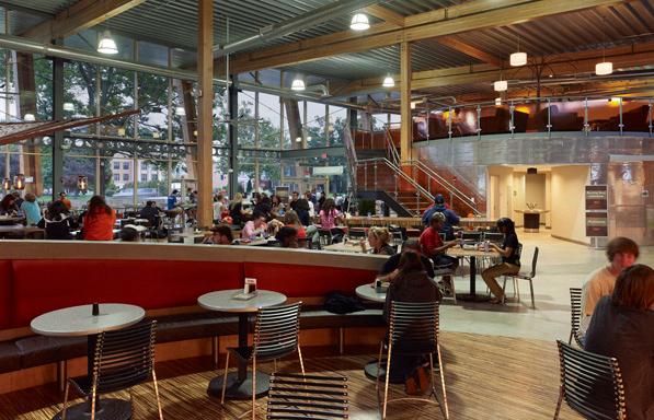 Sustainable features include a rooftop rain garden, on-site storm water retention and filtration, and LED downlighting. Exterior finishes, specifically Indiana limestone and western red cedar, flow into the building’s interior to blur the lines between the dining commons and its natural setting, and large expanses of glass take advantage of surrounding views.