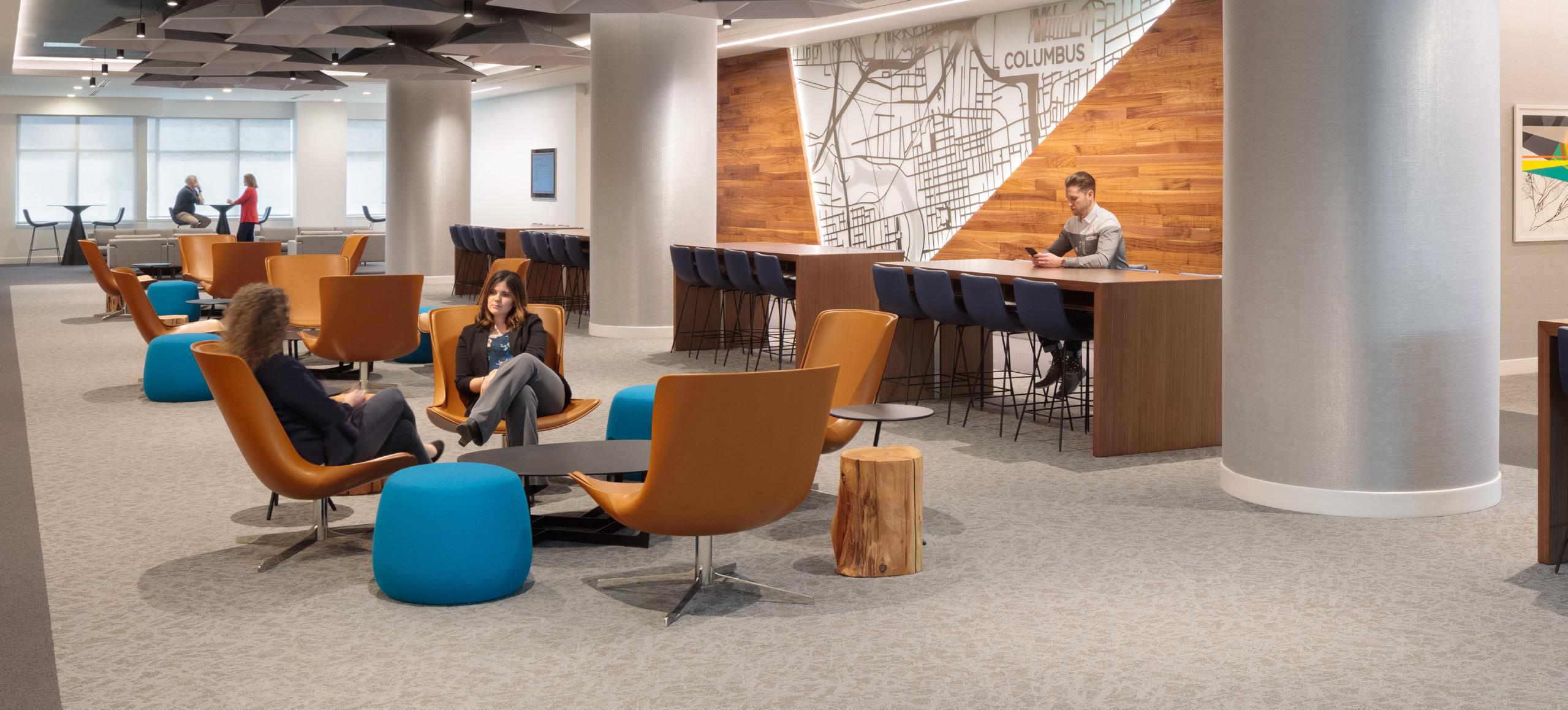 The café was also refreshed to allow open seating with collaboration areas. Each area of the design included additional power for charging of devices as well as a wireless network adjustment to allow end users to have wireless coverage. Within the executive suites, new conference and collaboration spaces were created to help with video conferencing meeting across the worldwide firm.