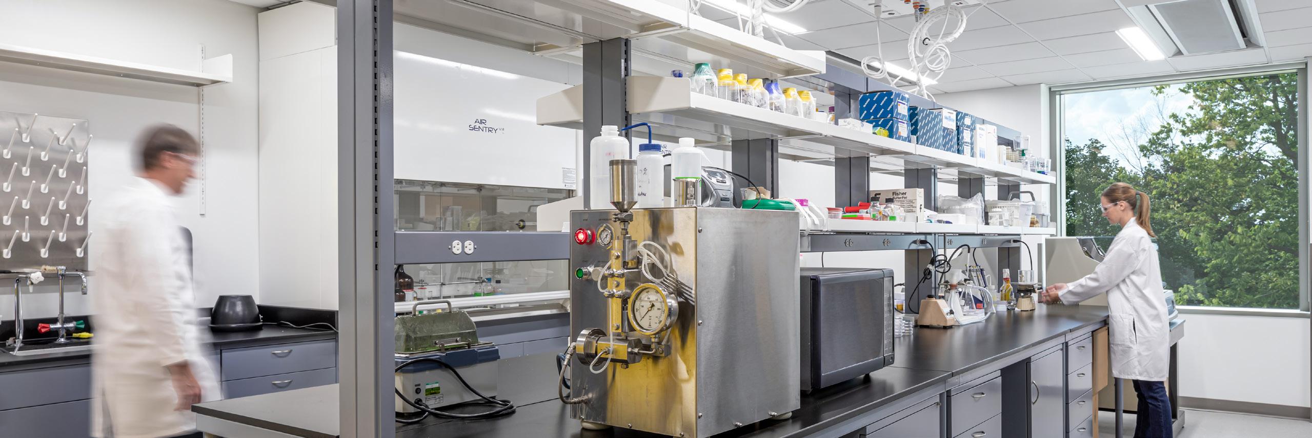 • Labs included pure water systems, as well as a point-of-use vacuum system to maximize flexibility. High- and low-pressure zones were used to induce air flow instead of fans, reducing required reheat energy. Where appropriate, ductless and filtered fume hoods reduced requirements to bring in outside air.