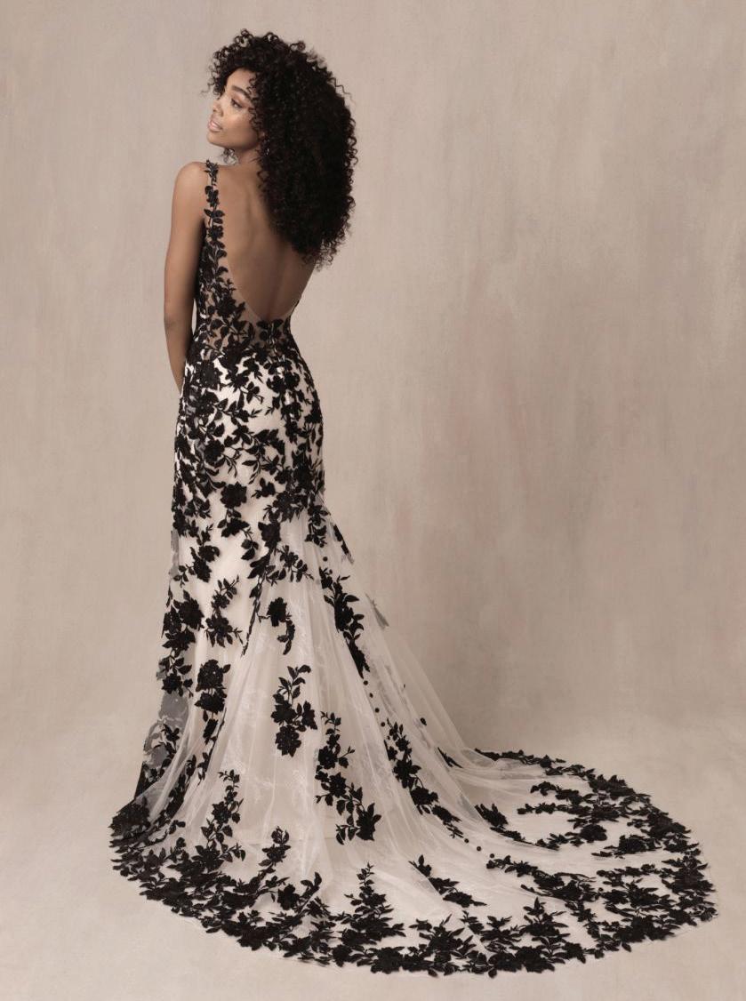 Photo #1: A timeless sheath silhouette with fashion forward details of black lace and low-back illusion.