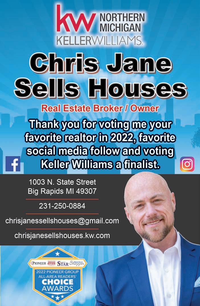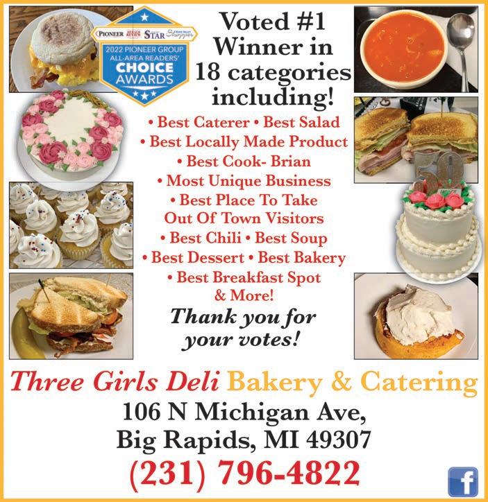 bigrapidsnews.com READERS’ CHOICE 2023 SATURDAY, JANUARY 21, 2023 25 Mecosta-Osceola CareerCenter WETHANKTHECOMMUNITYFORVOTINGFORUS! 15830190thAvenue•BigRapids Weoweoursuccesstoyourloyalsupport. Weappreciateandthankourcommunity! Independent Living/ Retirement Community/ Assisted Living Voted#1Winner! 231-592-1000 BigRapids • BoyneCity • CedarSprings •Cheboygan • Gaylord • Gladwin • Grayling HoughtonLake • Newaygo • Portland • RogersCity • Roscommon • WestBranch Wherethe Living isEasy. BrookRetirement.com Independent,Assisted&MemoryCareLiving PLACE TO TAKE YOUR KIDS ON A RAINY DAY THREE GIRLS BAKERY Card/Riley Wildlife Center Artworks WINNER IVAN’S CAMPGROUND Bandshell at Hemlock Park The Dragon TrailBig Bend Trailhead & Parking OUTDOOR ACTIVITY/ BIKE TRAIL/LOCAL WATER ACTIVITY SPOT WINNER THREE GIRLS BAKERY Big Rapids Bowling Center Toppings Frozen Yogurt PLACE TO CELEBRATE A BIRTHDAY WINNER PLACE TO TAKE OUT OF TOWN VISITORS THREE GIRLS BAKERY Ivan’s Campground and Cabins Lake County Historical Museum Baldwin WINNER ANGELS OF ACTION Mecosta County Animal Rescue Coalition Lake County Historical Museum PLACE TO VOLUNTEER WINNER BIG RAPIDS PENNZOIL & AUTO REPAIR Servicemaster by SMA Three Girls Bakery PLACE TO WORK WINNER FINALISTS FINALISTS FINALISTS FINALISTS FINALISTS FINALISTS PLACES