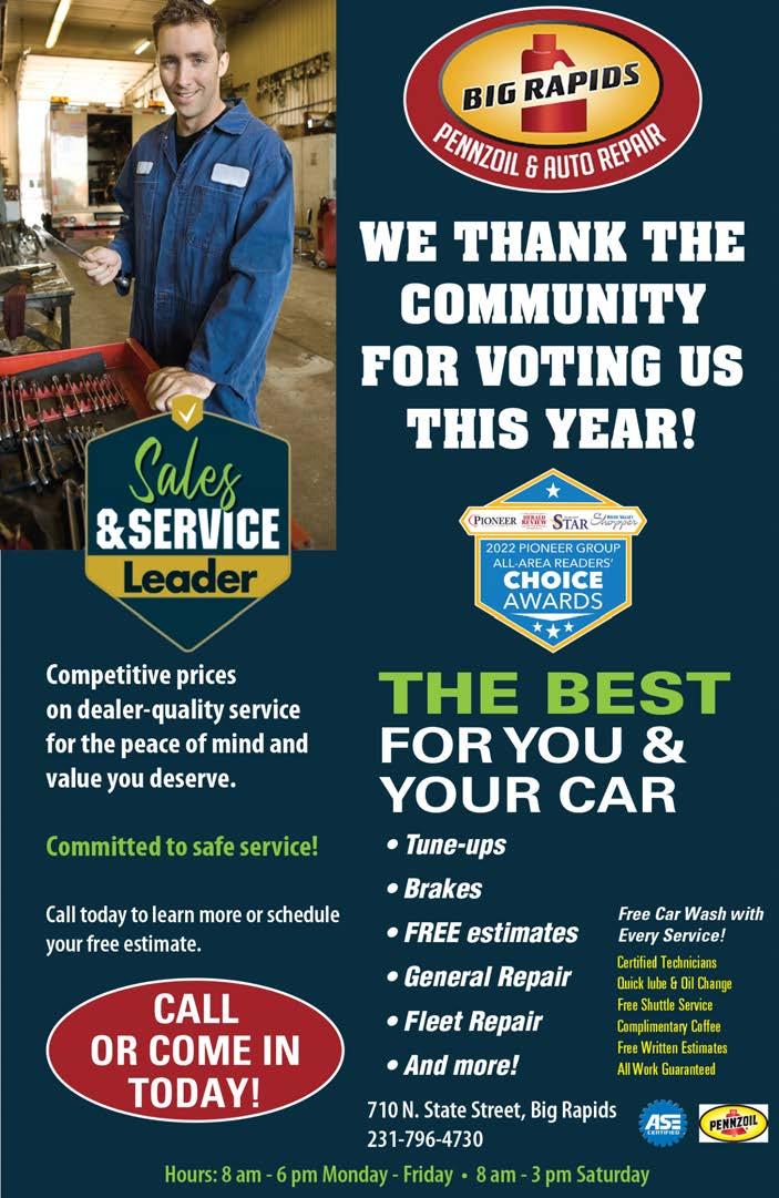 bigrapidsnews.com READERS’ CHOICE 2023 SATURDAY, JANUARY 21, 2023 2 15433220thAvenue BigRapids,MI49307 www.nhlscape.com (231)796-0925 nhslandscape@yahoo.com NEWHORIZONSLANDSCAPELLC LANDSCAPE/IRRIGATIONCONTRACTORS Thankyouforvotingforusasyour FAVORITE Landscaper - Winner Winner LawnCareMaintenance - Winner Winner SnowPlowing/SnowRemoval - Winner GardenCenter/Greenhouse/Plants - Finalist • Landscape Design/Construction • Ir r igationDesign/Construction • OutdoorMaintenance • N urser y Supplies • Hydroseeding Need a tune-up for your engine? Are your tires wearing thin? Windshield wipers getting scratchy? Muffler not doing its job? Whatever needs to be addressed on your vehicle, you can find a place in the West Central Michigan, from detailing businesses to oil change specialists to car washes to dealerships. Now that winter is here, it’s time to make sure your car is ready for the wear and tear of a Michigan winter. So, consider the awardwinning businesses in Mecosta, Osceola or Lake County for your next car service appointment. AUTO ACCESSORIES AUTO BODY SHOP WINNER O’REILLY AUTO PARTS PHIL HATCHEW AUTO PARTS DP Tire Service WINNER JR Customs And Collision M & M Collision A A Collision AUTOMOTIVE SERVICES FINALISTS FINALISTS