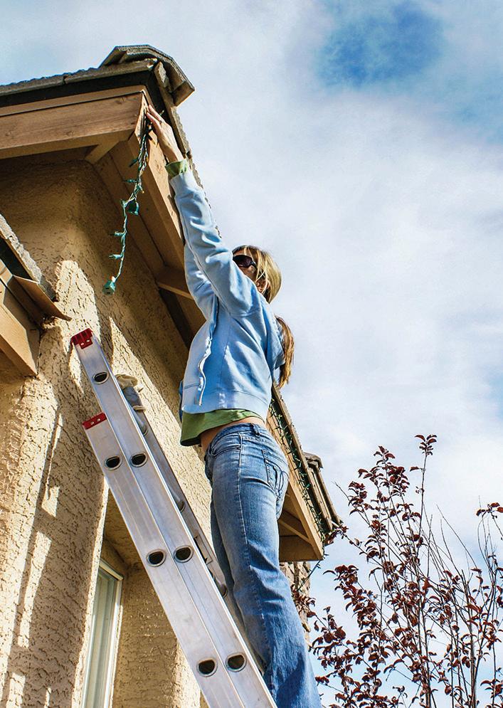• Pick the right day to decorate. Consult the weather forecast prior to decorating the exterior of a home. Pick a day when efforts to decorate won’t be compromised by wind, rain, snow, or other inclement weather. If it’s already snowed, avoid decorating until the snow has melted, as there could be ice lingering beneath the snow. It’s also unsafe to work on a snow-covered roof. Decorate on a day with ample daylight and pause decorating if weather takes a sudden, unexpected turn for the worse.