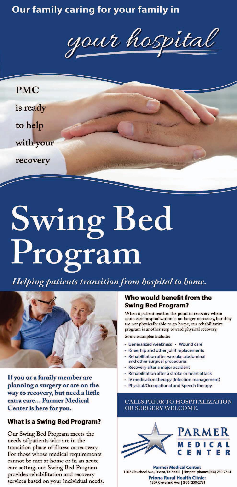 “Swingbedisskillednursingcareatahospitallevel.It’satransitionfromthehospital,preparingthemtogohomeanditkeepsthemfroma nursinghome,”notedFleenor.“Alotoftimesafter ahiporkneesurgerytheyneedalittlemoretime torecoverbeforegoinghome.Theygetalittle moreindividualattentioninswingbedwithspecializedcarethatreallyhelpsthem.”