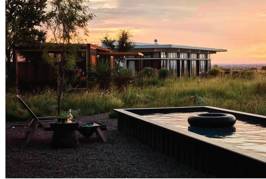 The grounds include outdoor living areas like a palapa with lounging areas, a dining area and a pool made from a shipping container buried in the ground—a nod to the structure’s modular construction.