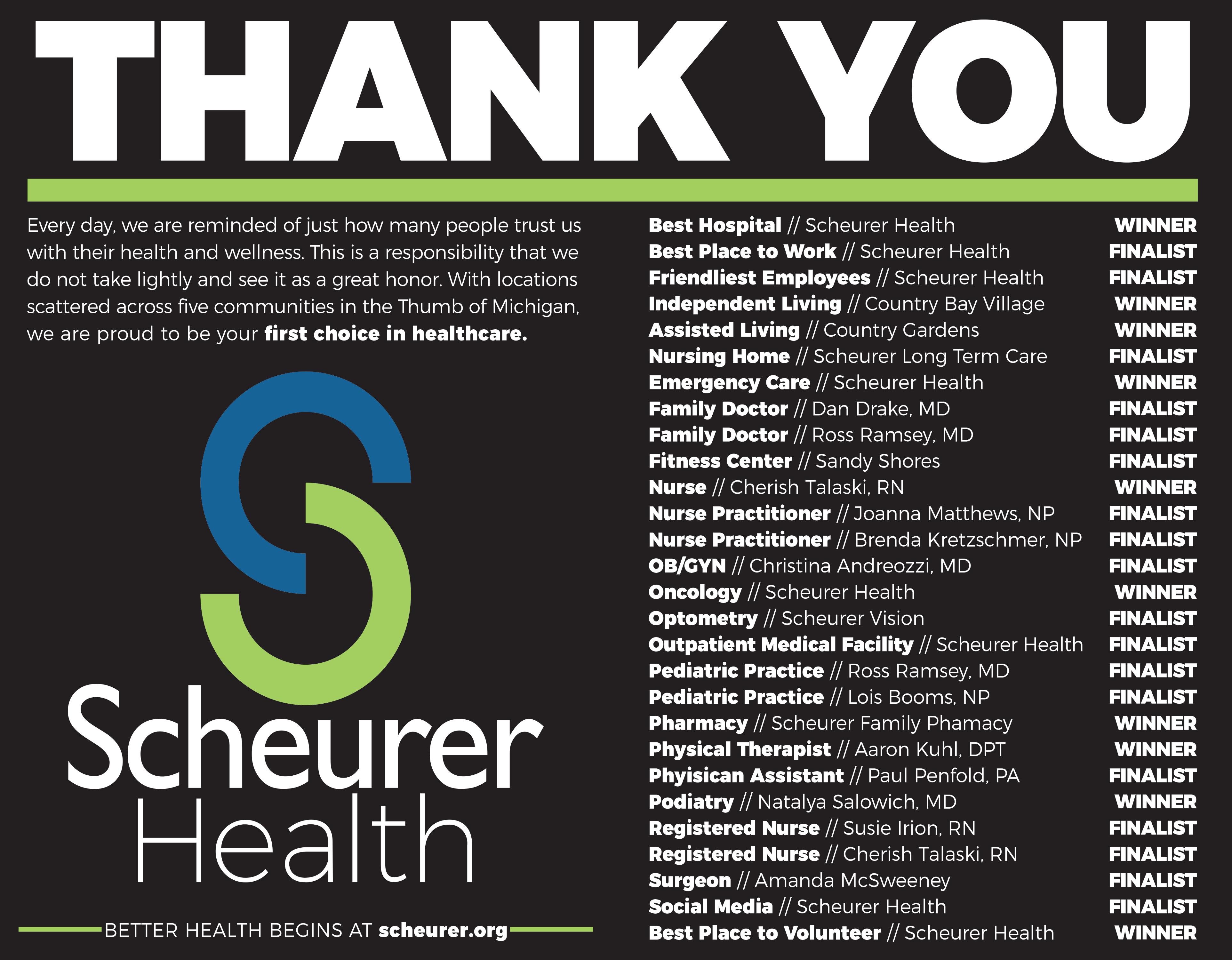 READERS’ CHOICE 2022 SATURDAY, DECEMBER 24, 2022 14 Slightly used & new women’s, men’s and children’s clothing, household items & more. Thumb Indus trie s, Inc. Thrif t St ore 721 N. Van Dyke Rd. • Bad Axe • 989-269-9998 Thank You for voting for us as your Thrift Shop! Hours: Monday -Friday 9 A.M. -5:30 P.M. Saturday 9 A.M.-5 P.M. Sunday 12-4 P.M. women’ r Thank you for voting Thumb Bank & T r ust the Best Bank! www.Thumb.Bank 866-862-3113 Where Relationships are Built on Trust HEALTH & FITNESS HOSPITAL INDEPENDENT LIVING/RETIREMENT COMMUNITY WINNER SCHEURER HEALTH FINALISTS Hills & Dales Covenant Saginaw WINNER SCHEURER COUNTRY BAY VILLAGE FINALISTS Northwood Meadows HOME HEALTH SERVICES/HOME CARE AGENCY HOSPICE WINNER HEALTH CARE AT HOME FINALISTS Compassus Huron Memorial HomeCare WINNER COMPASSUS FINALISTS Heartland Home Health Care & Hospice ProMedica Hospice Serving The Thumb FAMILY DOCTOR OR FAMILY PRACTICE GYM/FITNESS CENTER WINNER DANIELLE BROWN, PORT HOPE MEDICAL CLINIC FINALISTS Dan Drake, Scheurer Dr RamseyScheurer WINNER LIGROW’S FITNESS FINALISTS Sandy Shores Hills and Dales Fitness and Rehab DERMATOLOGIST OR DERMATOLOGIST PRACTICE EMERGENCY CARE CENTER/URGENT CARE/ER CENTER WINNER BOYCE BRENT M MD FINALISTS Frederick W. Roberts Pinnacle Dermatology WINNER SCHEURER HEALTH FINALISTS Hills & Dales Harbor Beach Community Hospital