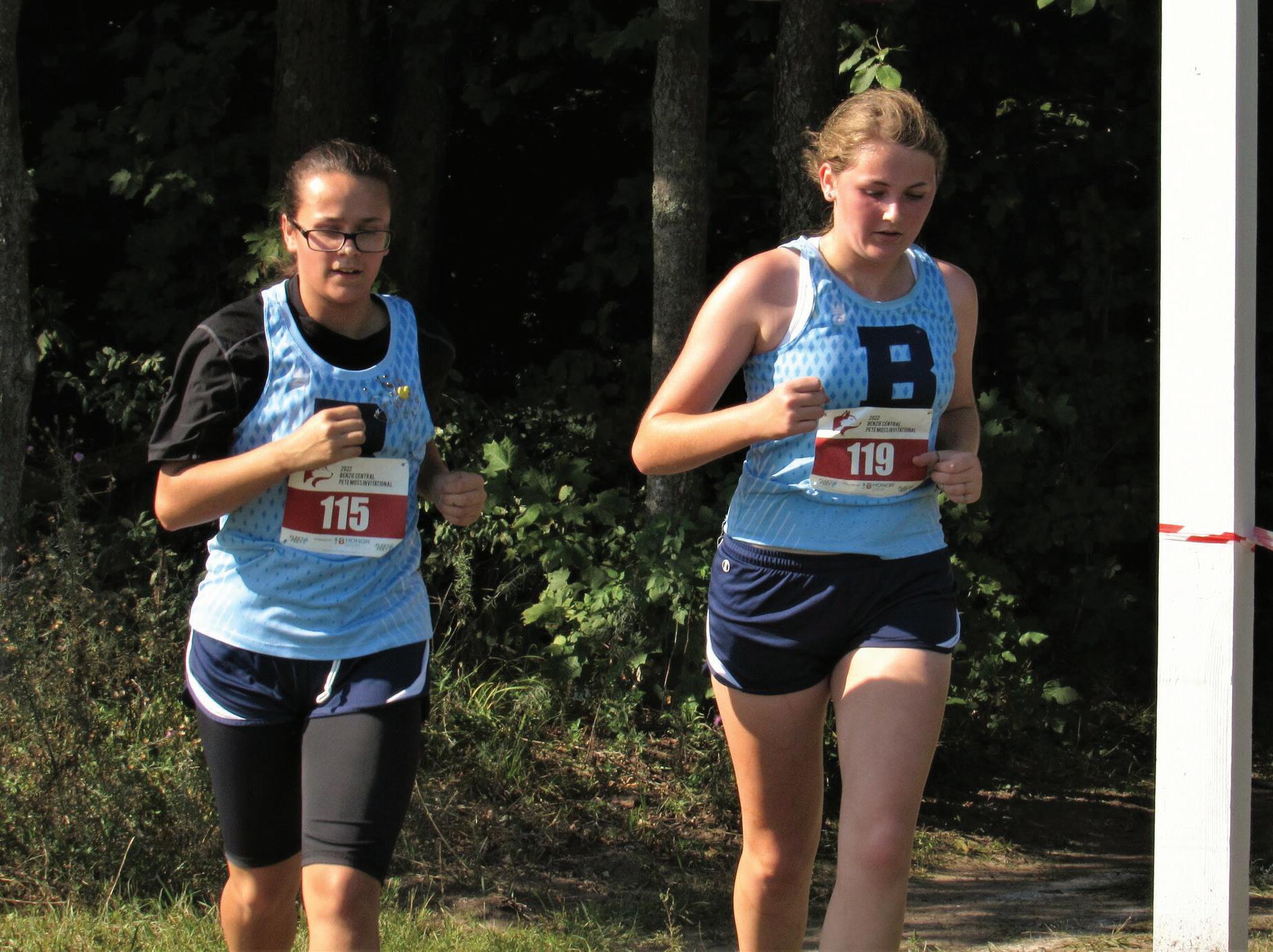 Brethren’s Autumn Harris (left) and Olivia Sexton compete in the 2022 Pete Moss Invitational on Aug. 26 at Benzie Central High School.