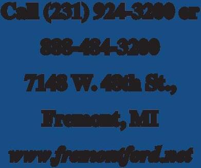 6 • PIONEER COMMUNITY ADVERTISER • Monday, March 25, 2024 L AWYERS SERVING FAMILIES Kyle M. G ould, Attorne y GOULD L AW FIRM • WILLS / TRUST S • PROBATE ESTATES • DIV ORCE • CUSTOD Y • REAL ESTATE C ALL NO W FOR CONSULTATION: 231-937-9180 230 W SHAW, HO WARD CIT Y • KYLEGOULDL AW COM 10 Miles North of Baldwin on M-37 231-266-5601 Prime Rib Experts Of The North Open at nOOn On thursday Friday saturday and sunday relax and enjOy yOur FavOrite beverage while playing KenO Featuring prime rib,lObster, King Crab, walleye, FrOg legs, and daily speCials S er ving a wor ld in need , one ac t of k indness a t a time. time Big R a pids Lions Club, Big R a pids , MI 231-937-2271 • 231-937-6 490 KRIS S TEVENS, OWNER algstevens@hotmail.com S.R. AUTOMOTIVE IN C MEC HANIC FOR THE PEOPLE 757 ENSLEY S T., HOWARD CIT Y MI 49329 Tuesday - Saturday 7:00 AM - 8:00 PM Sunday 7:00 AM - 2:00 PM WILLIAMS CAFE M-66 BARRYTON (BY THE BLINKING LIGHT) (989) 382-9602 Van Dyke’s n Engine Rebuilding 17 Westwood • Fremont 231-924-3170 • Head Pressure Checking & Reconditioning Crank Shaft Grinding • Engine Parts & Kits Available Providing Skilled nurSing PhySical TheraPy occuPaTional TheraPy SPeech TheraPy lPnS, Social Work cerTified nurSeS aideS and home healTh aideS PO Box 499 - 120 Hemlock St., Howard City, MI 49329 • 231-937-4514 acehomehealthcareservices.com/employment auntieace.com SMITH’S AUTO BODY Kelly Wheeler - O wner smithsautobody@yahoo.com 5786 70th Ave • Mecosta, MI 231-972-7933 | 231-972-7787 YOUR Owner / Broker • 129 West Upton Avenue Reed City MI TriciaWirthRealtor@gmail.com | TriciaWirthRealtor com Neighborhood Tricia Wirth EXPERT (231) 62 9 - 0352 Happy Eas E NJ O Y T HE SE E A S TE R -T HE PET ERSON’S Well Dr illing 231-266-5242 6856 W. 11 1/2 Mile Road • Irons MI Toll Free: 800-882-4963 Well Drilling Pumps Tanks Well S upplies Water Treatment pwdclc@yahoo.com Since 1954! MUFFLER & BRAKE Hours: M-F 8-5 Cl d S t/S 796-6335 14380 NORTHLAND DR.• BIG RAPIDS, MI SOUTH OF CITY LIMITS Across The Street From Pizza Hut Thankyou foryour business! Family owned and operated since 1970 (53 years) In memory of Dave Tassoni Call (231) 924-3200 or 888-484-3200 7148 W 48th St., Fremont, MI www.fremontford.net FR E MO N T E