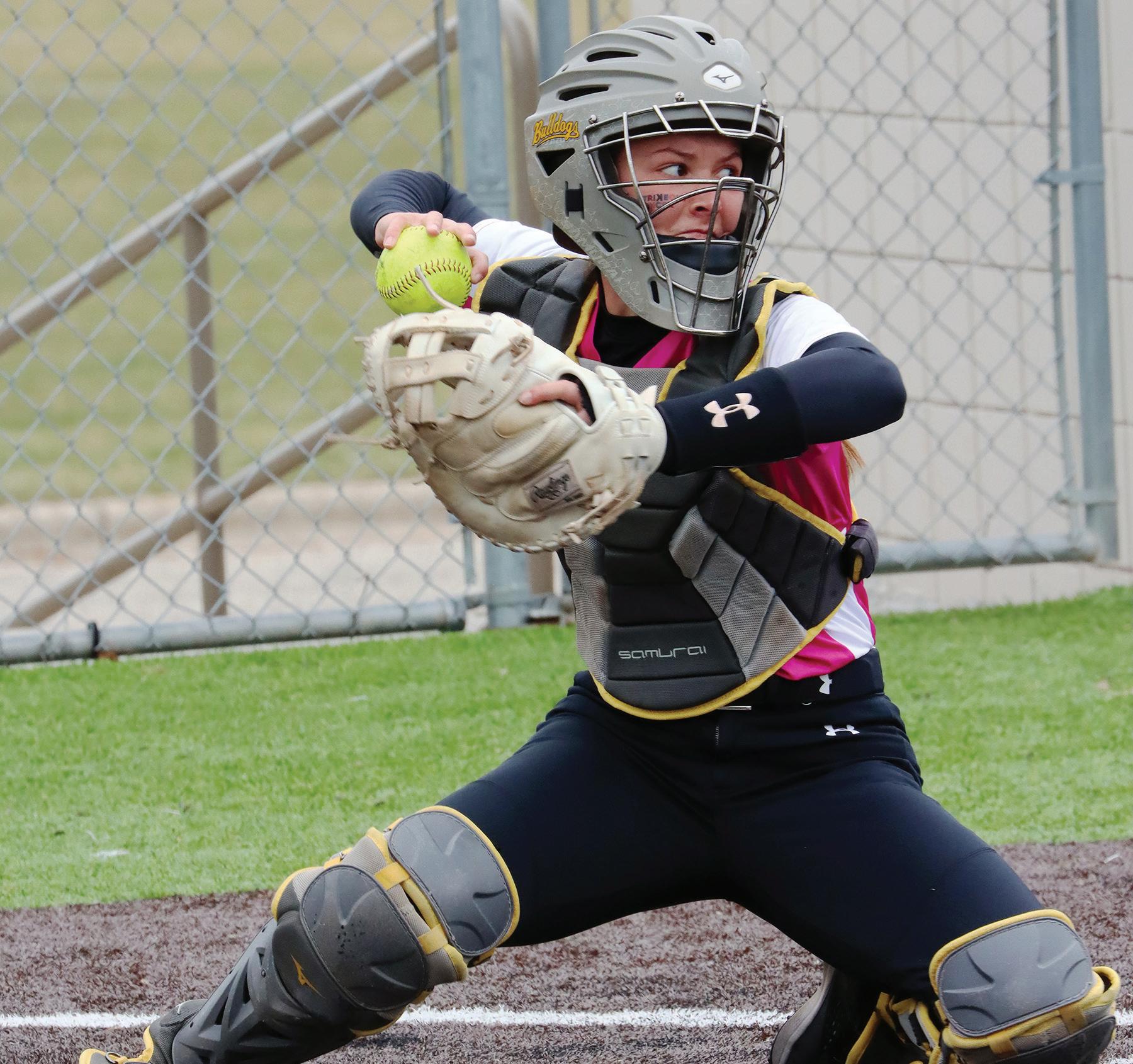 Ferris State University softball catcher Natalie Teague throws a ball to second base during a Spring 2023 home contest at the FSU Softball Field.