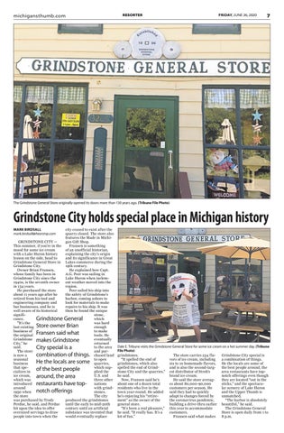 Dale E. Tribune visits the Grindstone General Store for some ice cream on a hot summer day. (Tribune File Photo) grindstones. The store carries 234 flaGrindstone City special is “It spelled the end of vors of ice cream, including a combination of things. grindstones, which also six to 10 homemade flavors, He the locals are some of spelled the end of Grindand is also the second-largthe best people around, the stone City and the quarries,” est distributor of Stroh’s area restaurants have tophe said. brand ice cream. notch offerings even though Now, Fransen said he’s He said the store averagthey are located “out in the about one of a dozen total es about 80,000-90,000 sticks,” and the spectacuresidents who live in the customers per season. He lar scenery of Lake Huron town year-round. He added said they had to quickly and the Upper Thumb is he’s enjoying his “retireadapt to changes forced by unmatched. ment” as the owner of the the coronavirus pandemic, “The harbor is absolutely general store. building a drive-thru earlier beautiful,” he said. “It’s been a real pleasure,” this year to accommodate The Grindstone General he said. “It really has. It’s a customers. Store is open daily from 1 to lot of fun.” Fransen said what makes 8 p.m.