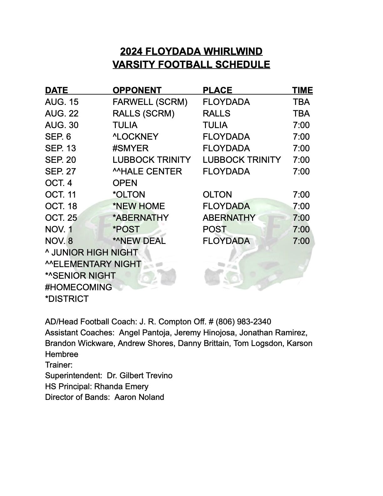 Fans can find the Floydada Whirlwinds full schedule including kickoff times online at floydadaisd.esc17.net/ page/football. For more high school football previews and coverage, visit myplainview.com.