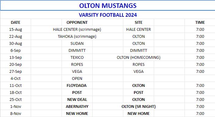 “I see us being able to be successful,” Lassiter said, adding that he expects a dog fight every week through District. There’s a break in Olton’s schedule between non-district and district play. Olton will kick off district by hosting Floydada in Week 7. The Mustangs will travel to Post in Week 8 before returning to host New Deal in Week 9. Abernathy, a new (but familiar) 2A conference opponent, will come to Olton in Week 10 and the Mustangs will travel to New Home for the last district game on Nov. 8.