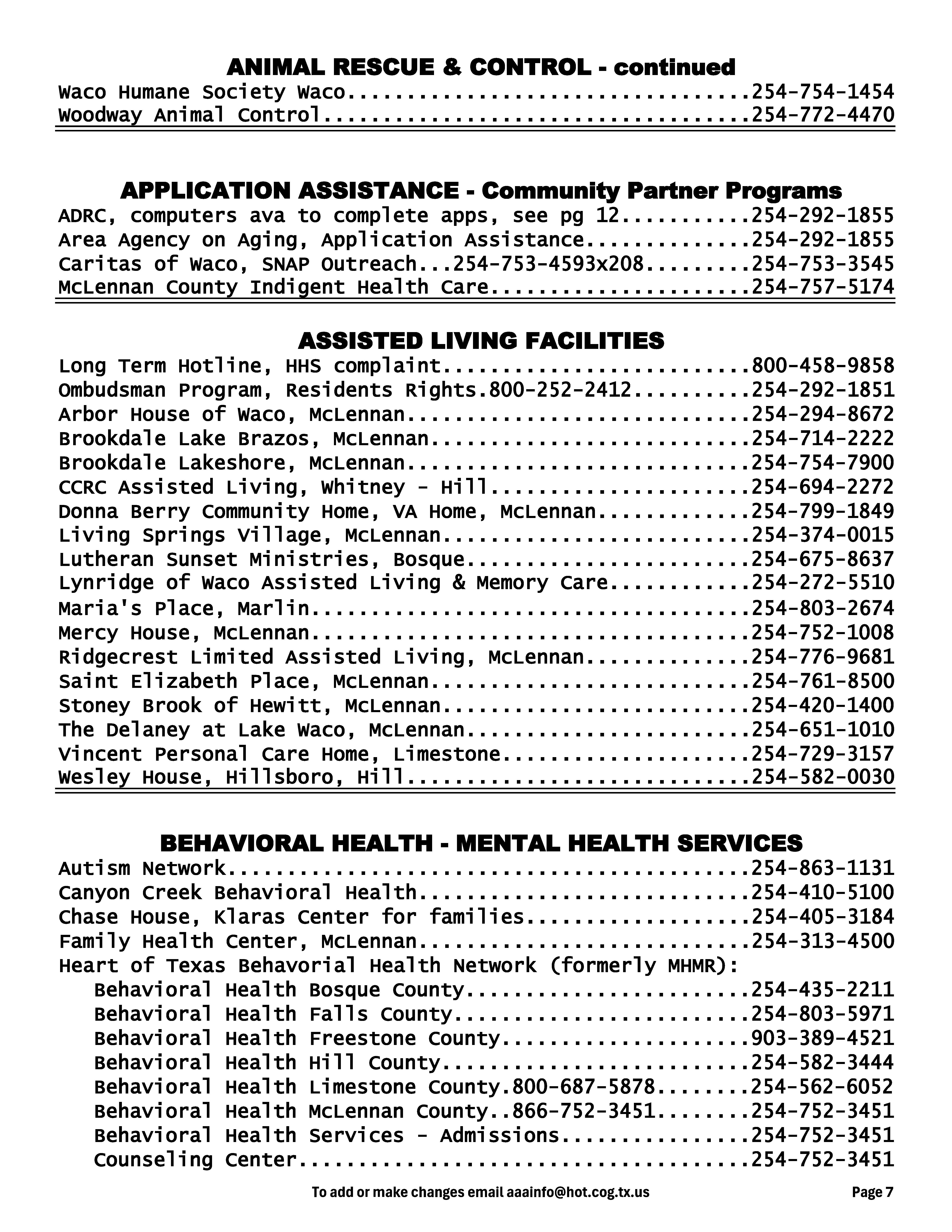 continued Waco Humane society waco .................................. 254-754-1454 woodwa Animal control .................................... 254-772-4470 APPLICATION ASSISTANCE - Community Partner Programs ADRC, computers ava to complete apps, see pg 12 ........... 254-292-1855 Area Agency on Aging, Application Assistance .............. 254-292-1855 caritas of Waco, SNAP outreach ... 254-753-4593x208 ......... 254-753-3545 McLennan county Indigent Health care ...................... 254-757-5174