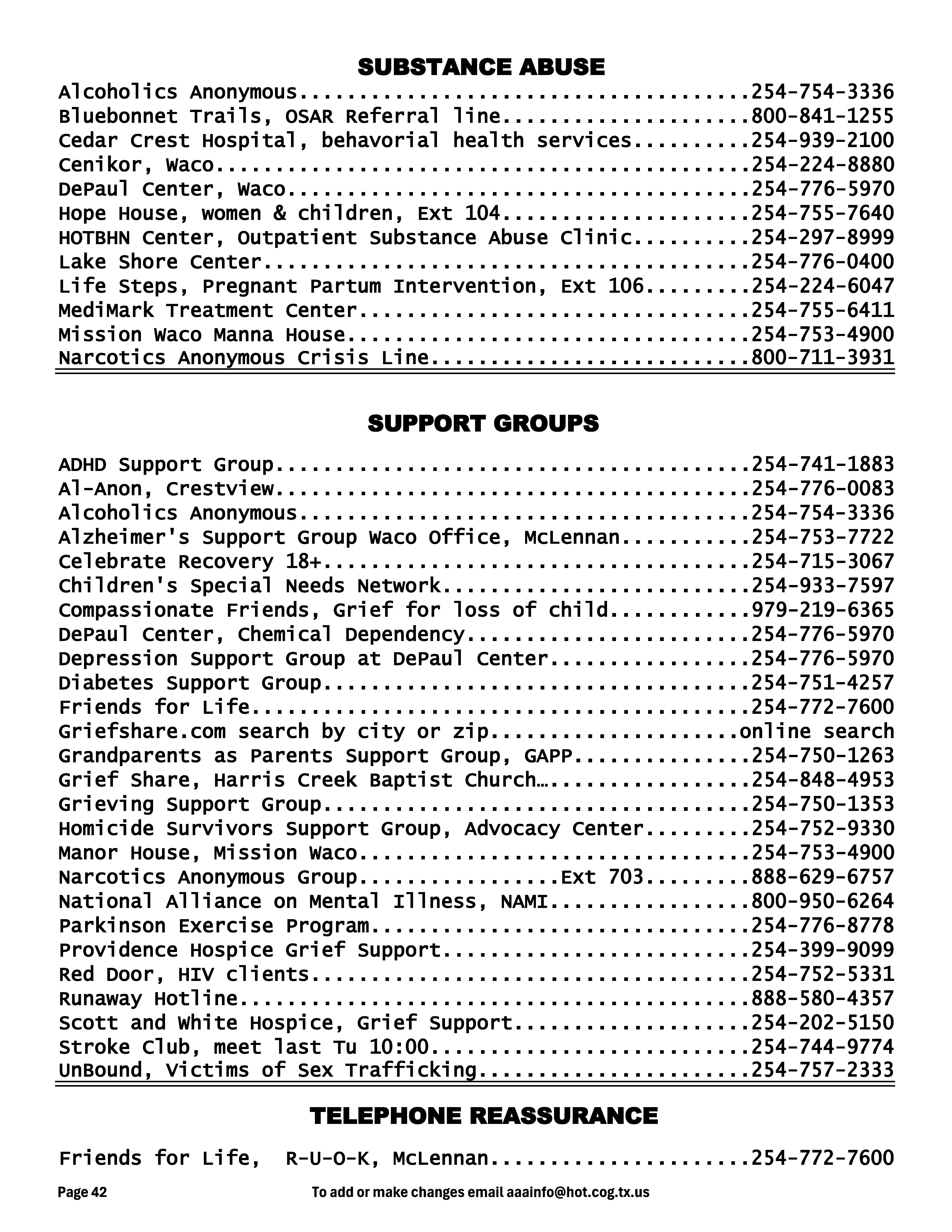 Friends for Life, R-U-O-K, McLennan ...................... 254-772-7600 Page 42 To add or make changes email aaainfo@hot.cog.tx.us